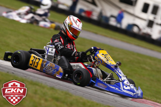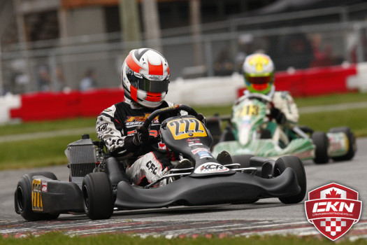 Final: In the penultimate race of the 2013 season Steven Szigeti (Zanardi) jumped to the lead from the outside line and as those behind quickly began to scrap back-and-forth he had a margin off the front that looked to stand up flag to flag. Kevin Monteith (Birel) had second spot early but he bowed out of both the race and championship contention with a dragging rear bumper early on. That gave the spot to Marco Di Leo (Praga) who was followed by Nicolas Dore (Birel). Zachary Claman DeMelo (Praga) had started on pole and second in the championship by just twelve points, but was knocked to seventh, just ahead of championship leader Olivier Bedard (Birel). The Praga driver then went on a charge that Bedard couldn’t match and the drive took him all the way to the title, his fourth in ECKC competition after winning in Mini-Max and twice in Rotax Junior. Claman DeMelo was back to third in short order, then had sizable gaps to run down to Di Leo first, then to Szigeti even farther out front. He got second just before half distance, then began to hunt the Zanardi kart. As much as a half-second quicker at times and consistently more than two-tenths, the freshly minted Canadian National Champion continually crept closer but never quite reached his destination. Flawless at the front, Szigeti put Zanardi on the top of the Senior podium for the first time while Claman DeMelo’s charge ended in second. Di Leo was third in his only Senior start of the season while Zacharie Scalzo (TonyKart) ran down Dore and took fourth. Bedard was seventh, and while he surrendered his championship lead he nonetheless confirmed a return trip to the Rotax Max Challenge Grand Finals in November as a member of Team Canada.