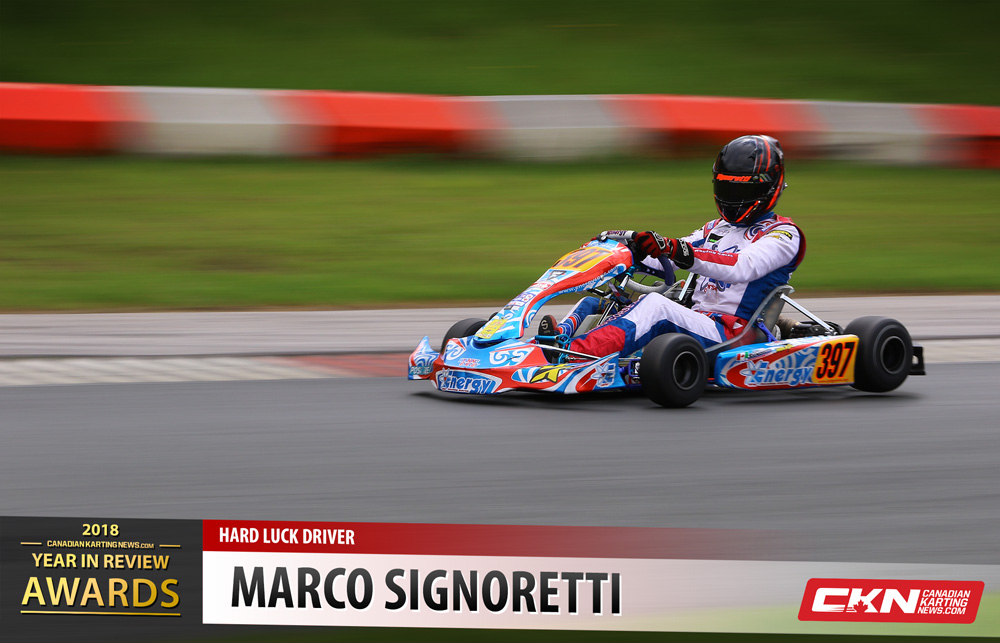 Our Hard Luck Driver of the year goes to Marco Signoretti after a couple of unfortunate events at Mosport Kartways this summer. In the third round of the Champion Ron Fellows Karting Challenge, Signoretti and Jon Treadwell had built up a points lead that put them in a race of their own, that is until the Final rolled around and Signoretti wasn’t on the grid.