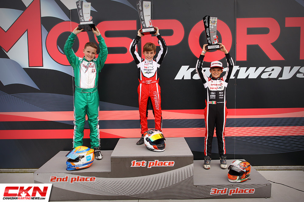It was immediately a race of three as Saturday winner Marcello Paniccia jumped ahead of Arseneau on the start with Anthony Sardelitti in tow, but the championship leader regained the top position before the opening lap was completed. Behind them, there was a three-kart battle for fourth between Andrew Maciel, Ryland Duesburry and Anthony Boscia.