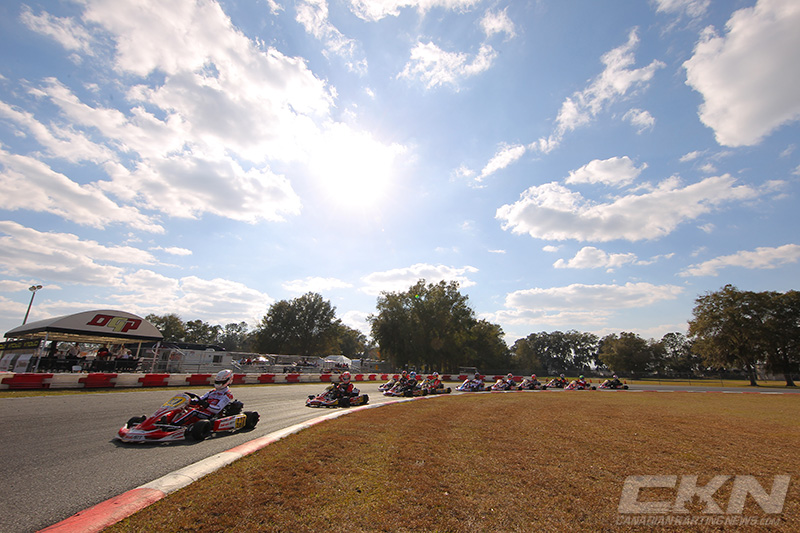 Ocala Gran Prix teammates Tyler Gonzalez, Fernando Barrichello and Jeremy Fairbairn led the way in Mini-Max Qualifying. It was another group with a very close set of times within the top-ten as positions two through nine were separated by only seven-hundredths of a second. Sebastian Montoya and Jak Crawford completed the top-five. The opening heat featured a shuffle behind heat winner Gonzalez as Crawford jumped up to second, Arias Deukmedjian third, Fairbairn fourth and Barrichello fifth.
