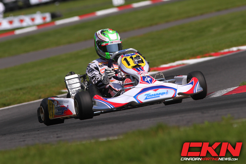 Sunday’s Championship finale saw Devlin Defrancesco (Defrancesco Racing/CRG) take the lead from the outside front row into turn one, as he squeezed pole-sitter Gianfranco Mazzaferro (Ferrolati Corse/Zanardi). Right away a front group of five was built as JP Hutchinson (TonyKart), Thierry Cote (PSL Karting/CRG) and Natael Cantin (SRA Karting/Birel) joined the front two. Lap after lap, Mazzaferro and Defrancesco traded the top position as Mazzaferro would pass down the long back straight, and Defrancesco would counter in the infield.