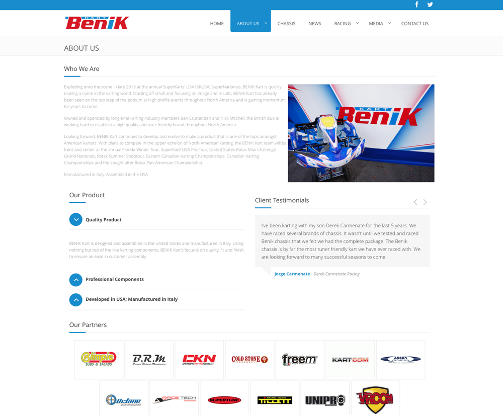 Designed by International Karting Media’s Cody Schindel, the website is a clean and user friendly, just like the BENIK Kart. With key areas that promote their new arrive and drive program and the quality BENIK Kart product, the website also features social media applications, latest news and results for BENIK Kart drivers as well as an upcoming schedule and photos.