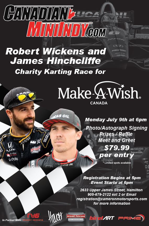 In the lead up to this year’s Honda Indy Toronto, Hamilton-based Canadian Mini Indy is offering race fans the chance to get on track under the watchful eyes of Indycar stars Robert Wickens and James Hinchcliffe! A charity event July 9th will benefit Make-A-Wish Canada, and allow drivers the chance to race into the evening and meet the Schmidt Peterson Motorsports’ teammates afterwards.