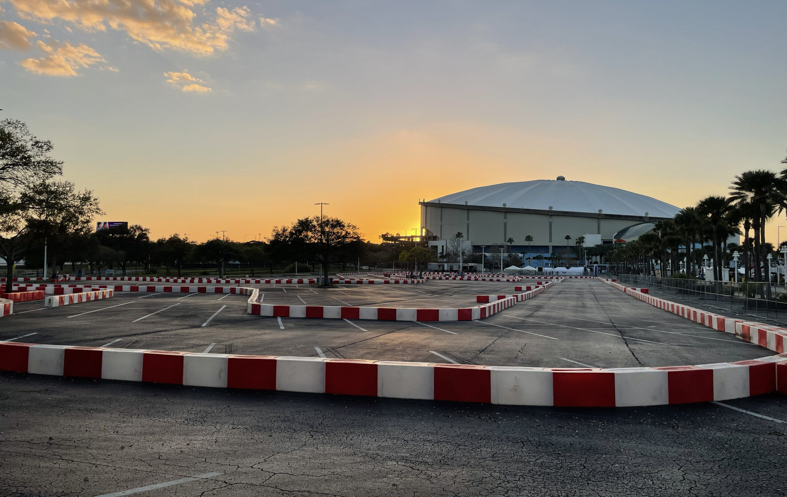 Setting up in the front parking lots of Tropicana Field, home of the Tampa Bay Rays baseball team, a temporary circuit has been set up by the Rok Cup USA staff, creating a unique and challenging circuit. A little shorter than usual, with lap times in the mid to high thirty-second range, this creative track will provide some intense racing this weekend.