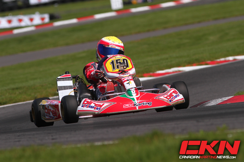 Leading the way, Nataël Cantin (SRA Karting/Birel) blistered off a lap-time of 56.489 seconds to earn the Canadian Tire SuperPole at this years Canadian Karting Championships. Thierry Côté (PSL Karting/CRG) did all he could to better Cantin’s time, but at the end of the session had to settle for second, only 0.092 seconds off. Provisionally, Devlin Defrancesco (Defrancesco Racing/CRG) held the third position in qualifying, however a technical inspection removed him from the results, forcing him to start each heat race from the rear. This allowed Gianfranco Mazzaferro (Ferrolati Corse/Zanardi) to jump into the inside-line third position, with Samuel Lupien and Alexander Murphy completing the top-five.