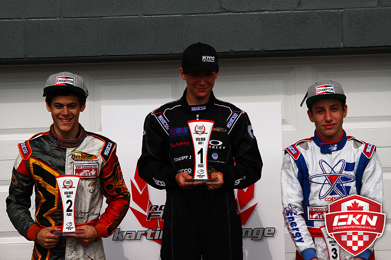 Junior Rotax podium topped by Russell Boyle alongside Jordan Slipacoff (l) and Joe Soranno (r) – Photo by: Neelan Nadesan/CKN)