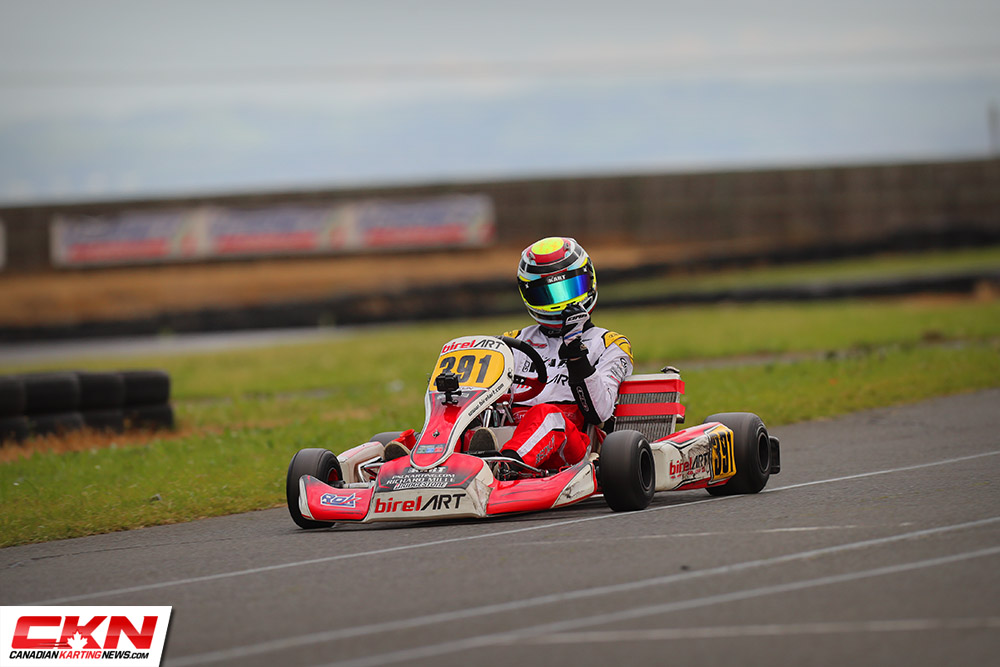Following a brief shower in the Prefinal that mixed up the running order, Canadian Jordan Redlin (Vemme Kart) led the field to green. Making the most of his eighth-place starting spot on Saturday, Becklin worked his way up to the third step of the podium, following great drives by Jake Drew (Kosmic) and Redlin, that saw Drew track down the race leader, overtake and eventually pull away when Redlin made a mistake on the final lap trying to set up a pass.