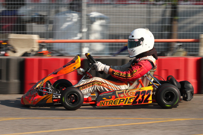 From the first session we changed the jetting and some factors that would make the kart handle better. As we were getting ready for qualifying the sun peaked out of the clouds and the track started to dry so we watched to see how the other karts were handling and if it was a good choice to go to slicks. As a dry line appeared we decided to switch to slicks, and so did everybody else. This was our first time out in the dry on this new track and we did not know how it would feel. And to make matters worse, a couple of inches off the dry line the track was still very wet and slippery. I was just getting up to speed and I had a good gap until the kart in front when a driver put a wheel wrong and went onto the water and crashed. The next lap a driver did not notice the yellow flag and he collected the kart that was already into the wall, which caused a red flag. This caused me to lose my gap from the kart in front. Once we got going again we only had three minutes left in qualifying and I could not get a fast lap in because I was stuck in traffic, so I had to settle with third place.