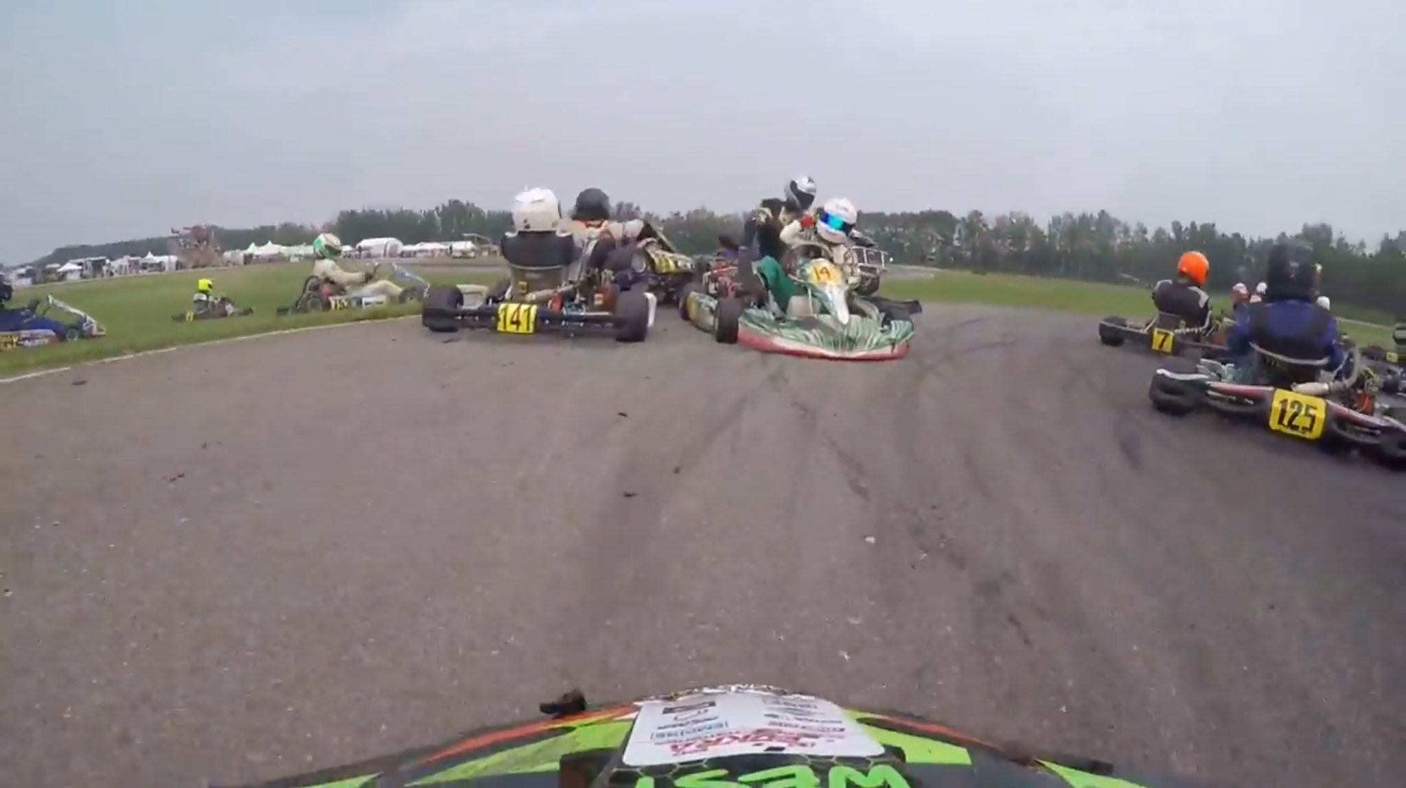 While I was in the ambulance, it appeared that everyone had brought their karts to the pre-grid for repairs. There was even a kart on a chassis table when I got there. I was supposed to go to the hospital but instead chose to watch my brother race. They lined back up and 33 karts made it through the first and second corner clean. The 22-lap final was on and anyone could have won it. There was a fantastic three-way fight for first and I was hoping my brother could get in there too as he was fourth. Some contact on the final lap would throw my brother back to nineteenth. A disappointing end to the weekend for both my brother and I.