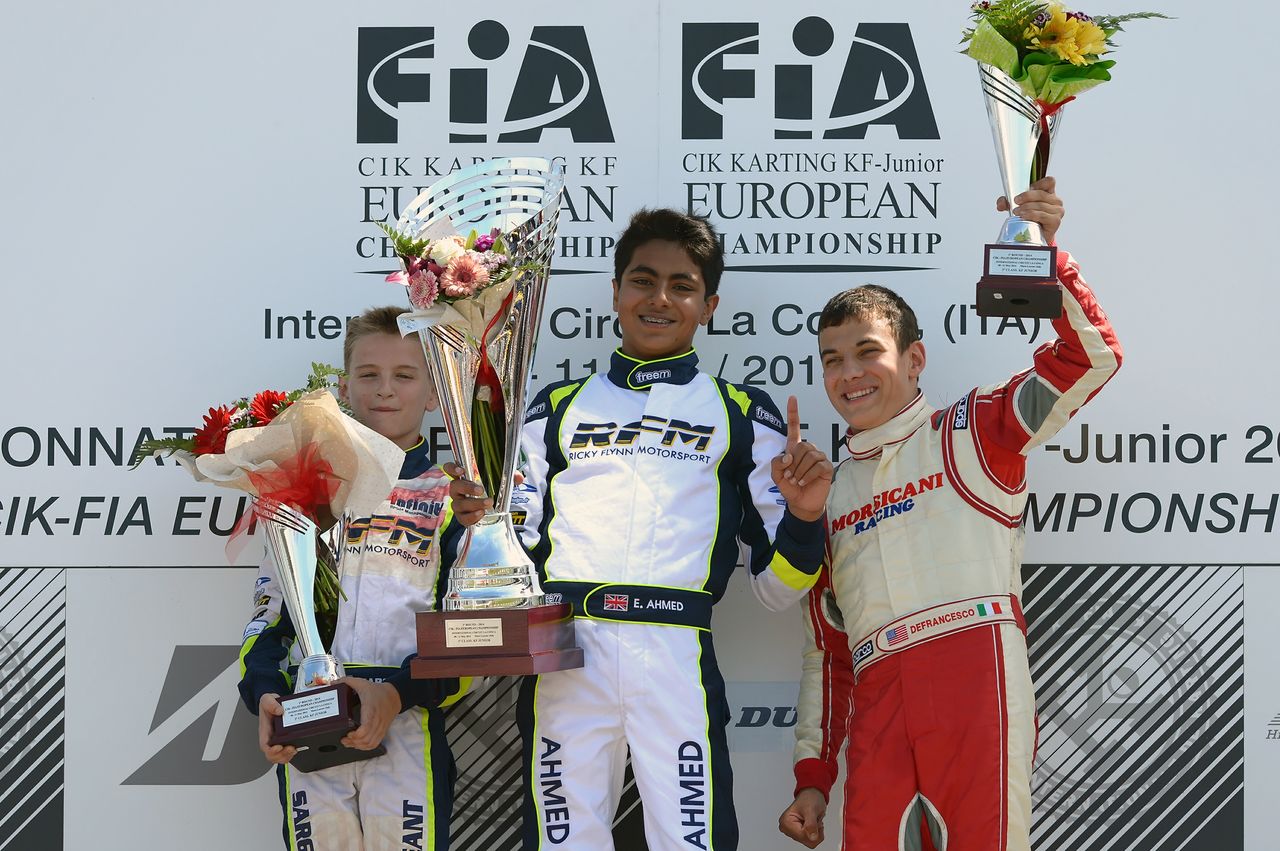 Devlin Defrancesco (r) on the podium in Italy (Photo courtesy: CIK)