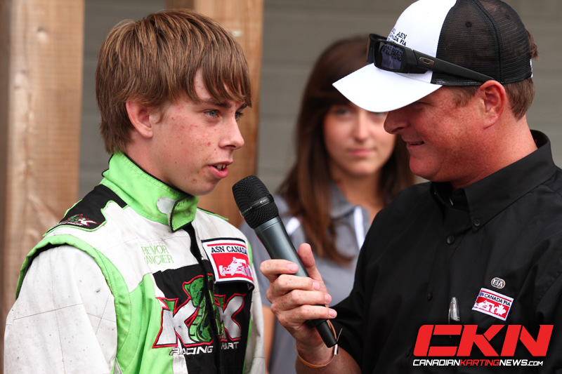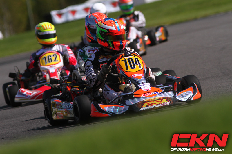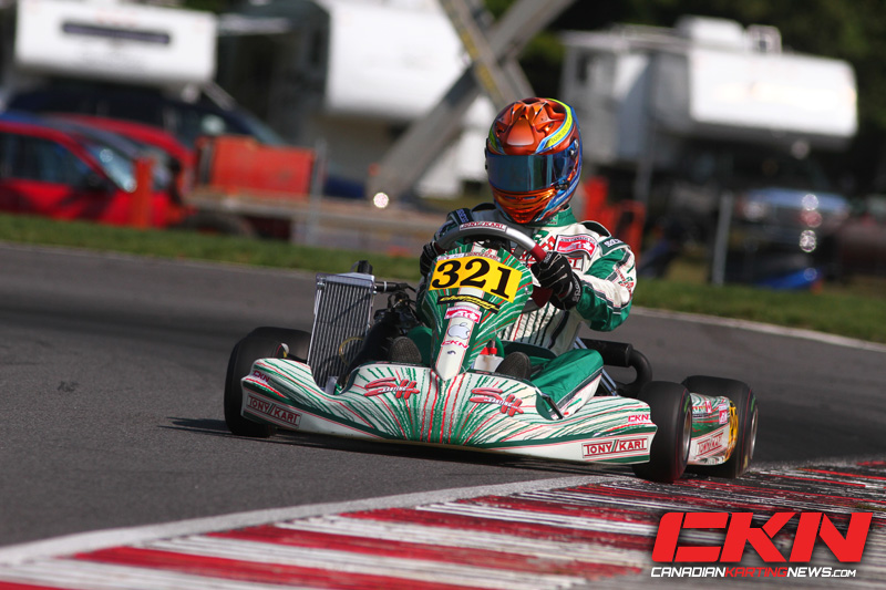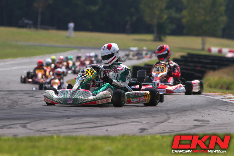 After the first start attempt was waved – no unusual incident there, as it happened eighteen times over the weekend – the field got the green the second time down and trouble in row three meant Ouellet, Olivier Bedard (Birel) and Nicolas Faure (TonyKart) had a break they’d keep for the entire time. It was a scene that repeated exactly in the final as well. Ouellet, Bedard and Faure went one-two-three at the start, and if Bedard checked out on the field in second, Ouellet had Express Check-Out at the head of the line. He was the only kart to go under 56 seconds, and was six seconds clear at the checkered flag. Bedard was another five ticks clear of third, a position that offered up the most action of any in the race. Christophe Paquet (CRG) took it from Faure first, and went to the head of a line five karts long, a line Nicholas Dore (Birel) was picking his way through. Dore was into fourth by half distance, and took third one lap later. Paquet responded by getting the spot back, but Dore took it for good on fifteen and the Junior podium was set: Ouellet, Bedard, Dore – with Ouellet invited to Team Canada and the Grand Final in Portugal this Fall. Tyler Kashak (Intrepid) took fourth the final time through turn two, but Faure torpedoed him in looking for it back allowing 2011 Mini-Max National Champion Jeffrey Kingsley (Birel) and Anthony Tolfa (Maranello) to cruise through to fourth and fifth.