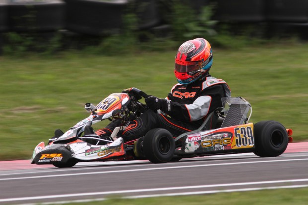 After mesmerizing drives to first and second on Saturday, the pair of reigning World Champions once again had the attention of the paddock Sunday and the PSL/CRG of Pier-Luc Ouellette and SRA Karting/Birel of Ben Cooper began the day’s showdown in qualifying. First Cooper put down a track record 35.49 second lap on seven, only to have PLO respond on the eighth and final lap of the session with a 35.40 second lap of his own! It was a definite indication of what was to come for the second straight day. Row two clocked at twin 35.5, Hugo Ouellette edging Christophe Boisclair, while Brendon Bain nipped the Karts&Parts/LH Kart of Daniel Burkett for the inside slot on row three after each pegged 35.6 seconds. Entering the weekend the track record belonged to 2010 World Champion Daniel Morad, who earned pole position at the Nationals back in 2009 in a time of 36.129 seconds. The top eight all bettered that time on Saturday, Cooper taking pole at 35.725, and on Sunday the top six each bettered the pole time from race one, and the top fifteen all bettered the track record entering the weekend!