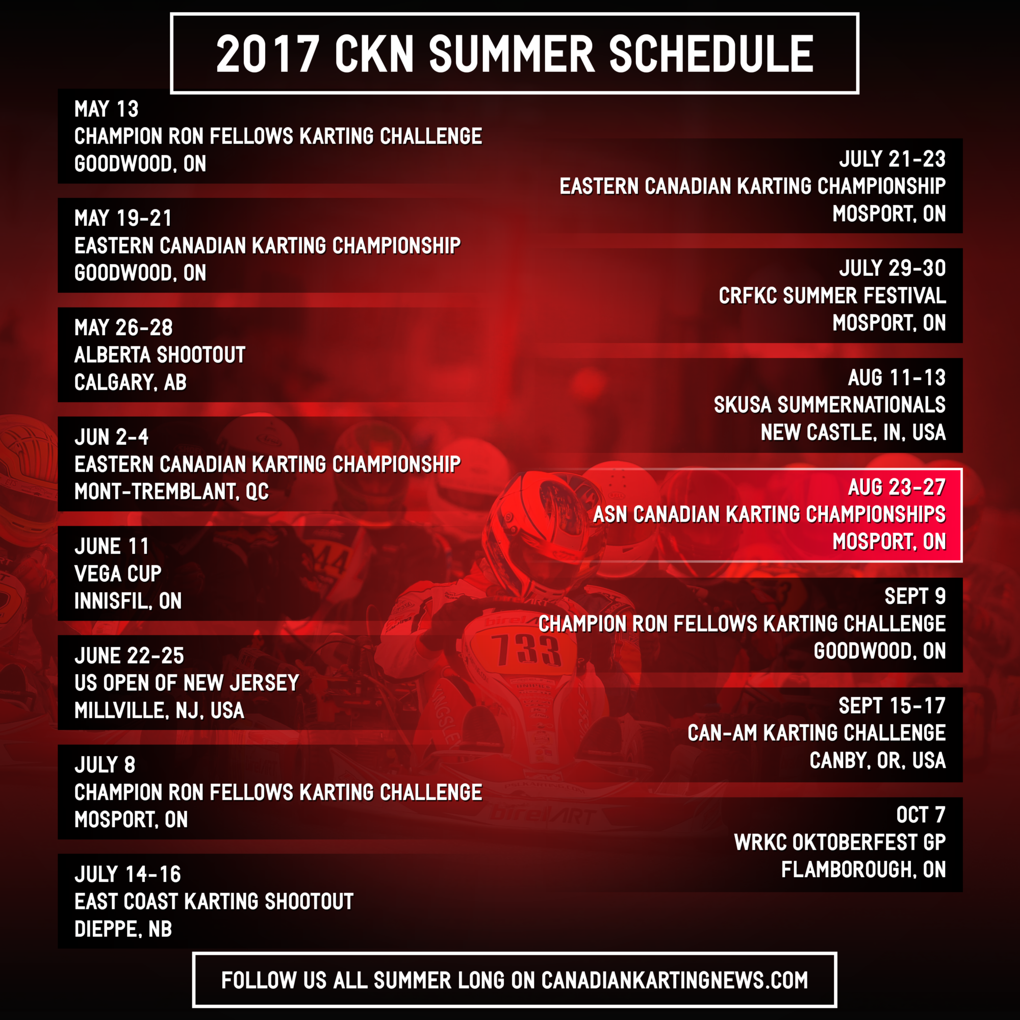 We will be track side for all of the Eastern Canadian Karting Championship events, Champion Ron Fellows Karting Challenge races, the ASN Canadian Championships and more. See the image below for our official schedule of events. **Schedule is subject to change