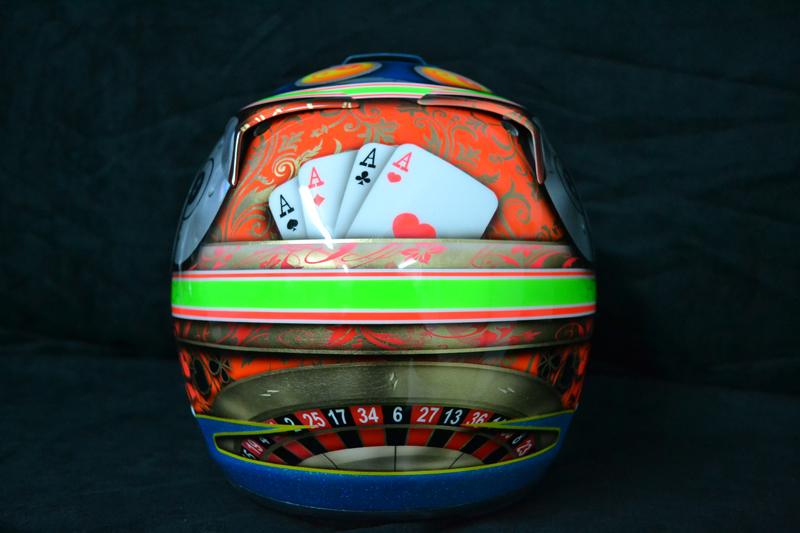 Hard to pick one, I’d say they must be the ones that provide good challenges. Marc-Andre Bourgeois’ helmet was quite something to do, chrome based with glossy and matte finish, but especially because of all the gear details on it (see picture). It literally took 30 hours to paint. Tagliani’s Indy 500 and Vegas editions in 2010. The Indy one had all the previous winners written on it and the Centennial logo. On the Vegas edition, I used gold leafing to make it an old Vegas look, along with the classical cards and roulette.