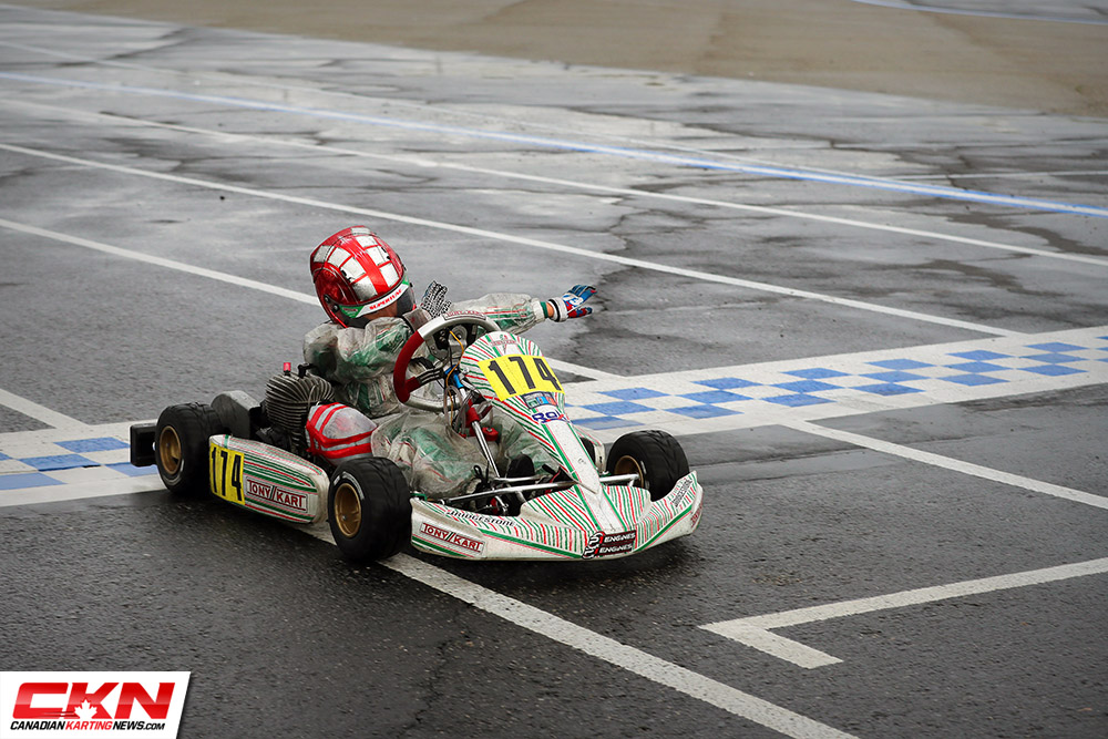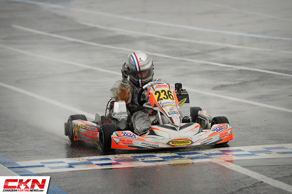 In similar conditions to the Senior Rok Final, the Masters Rok drivers were really challenged when the skies really opened up. For them, the track worsened every lap as their race continued on, but that didn’t stop Erik Jackson and Derek Wang from going toe-to-toe. Lap after lap, the two were bumper to bumper, navigating the puddles and remained close. Jackson led nearly the entire race and managed to keep Wang behind on the final lap to score the race win. A very distant third was Nick De Graaf, who crossed the finish line fifteen seconds adrift.