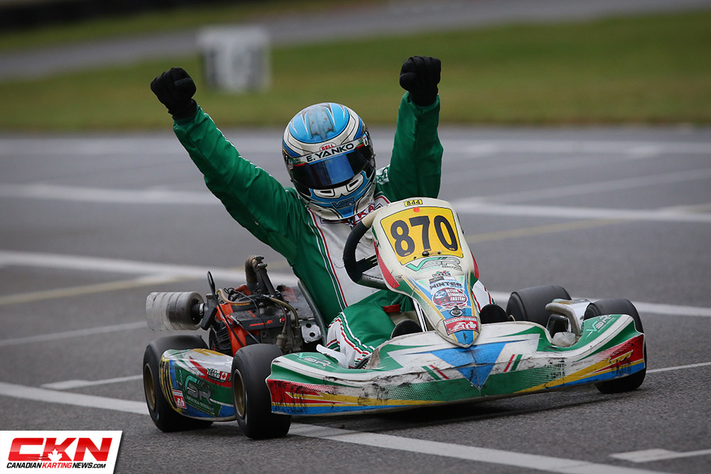 Doing battle at the same time as the Seniors, Eli Yanko (VSR/TonyKart) powered away to victory in the Briggs Masters category, while Scott Jefferies (REM/Kosmic) cruised home in second and Sylvain Coulombe (Premier/TonyKart) took third.