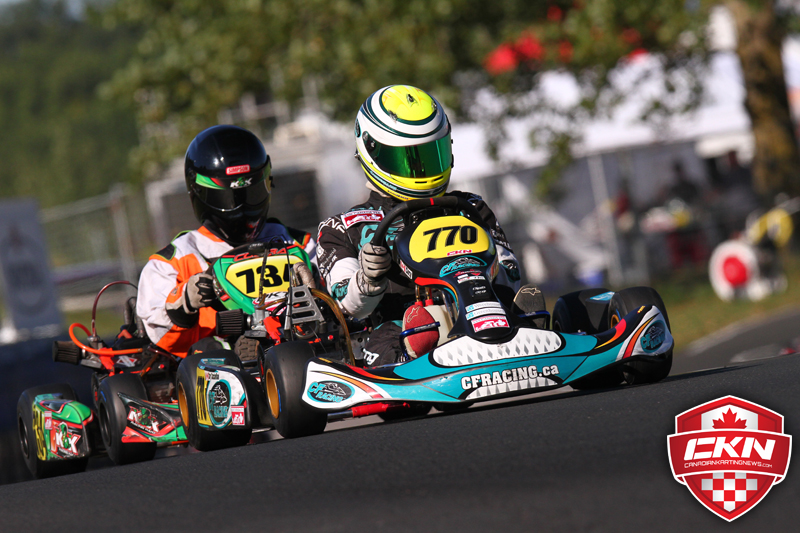 The largest class of the weekend has provided plenty of excitement. Each heat race has featured some hard racing, heavy hits and lots of caution flags, but nonetheless has been great all week long. The two teammates of JF Lafontaine (Birel) and Vincent Cyr (Birel) have been lightning fast when running together so far, and with both starting on the front row for each heat race it’s no wonder they were tough to beat. However, Gerald Caseley (PSL Moncton/CRG), Cory Cacciavillani (CF Racing/Birel) and Kyle Edgar (K&K Kart) wanted to split up the lead duo and did so in both the second and third heat race on Saturday.