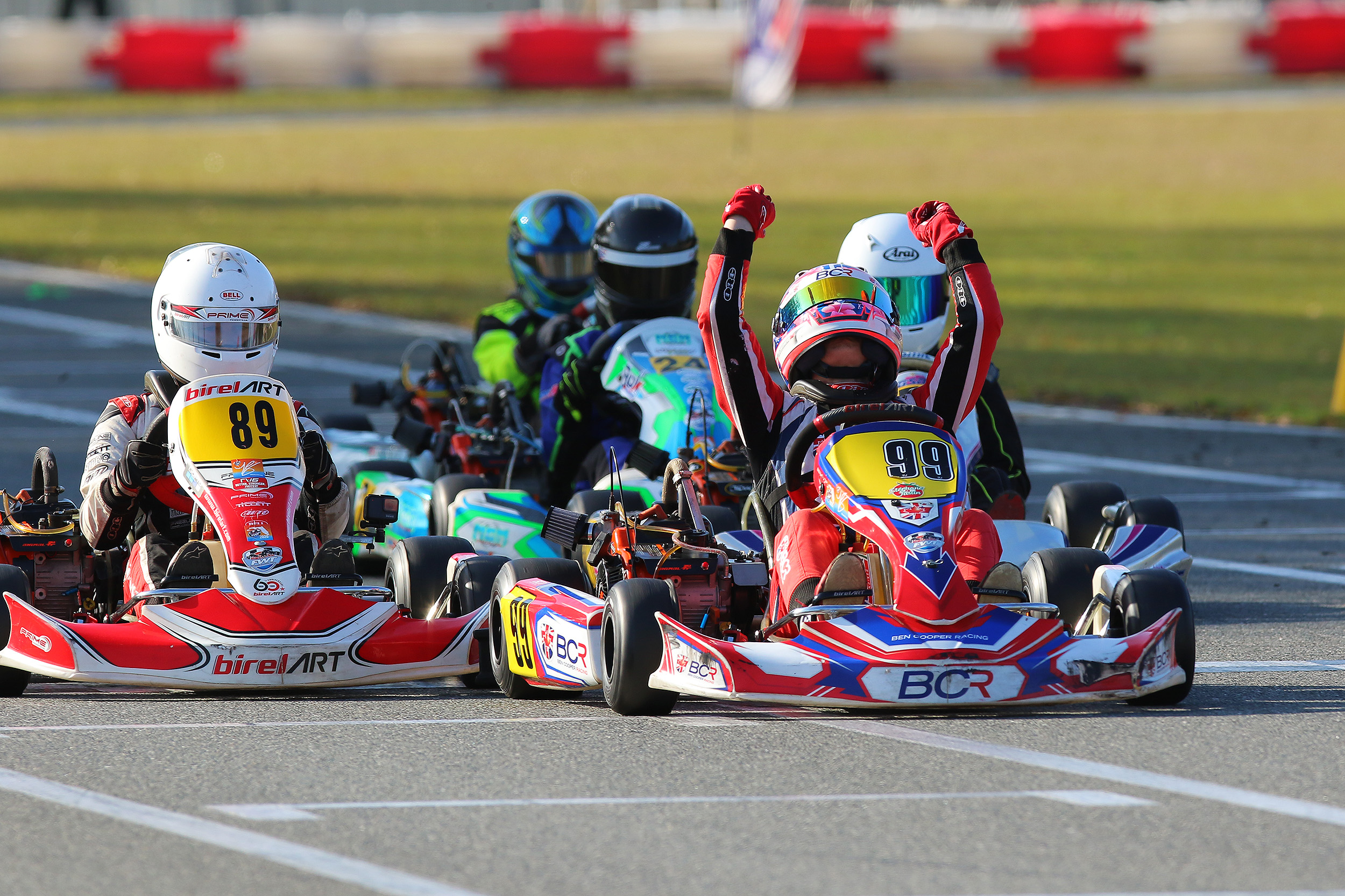 Canada’s third trip to the podium in the morning run of Finals came in the hands of Ilie Tristan-Crisan (BCR-PSL/BirelART), who drove superbly to finish second in the Micro Rok Final, overtaking for the position on the final lap. Jensen Burnett (AKT/Energy Kart) finished fifth in the race as well, while Zachary Hitchcock (JC Karting/Kosmic) had his great start ended early with a spin in corner four that ended his race, finishing one spot behind Rocco Simone (Goodwood/Intrepid).