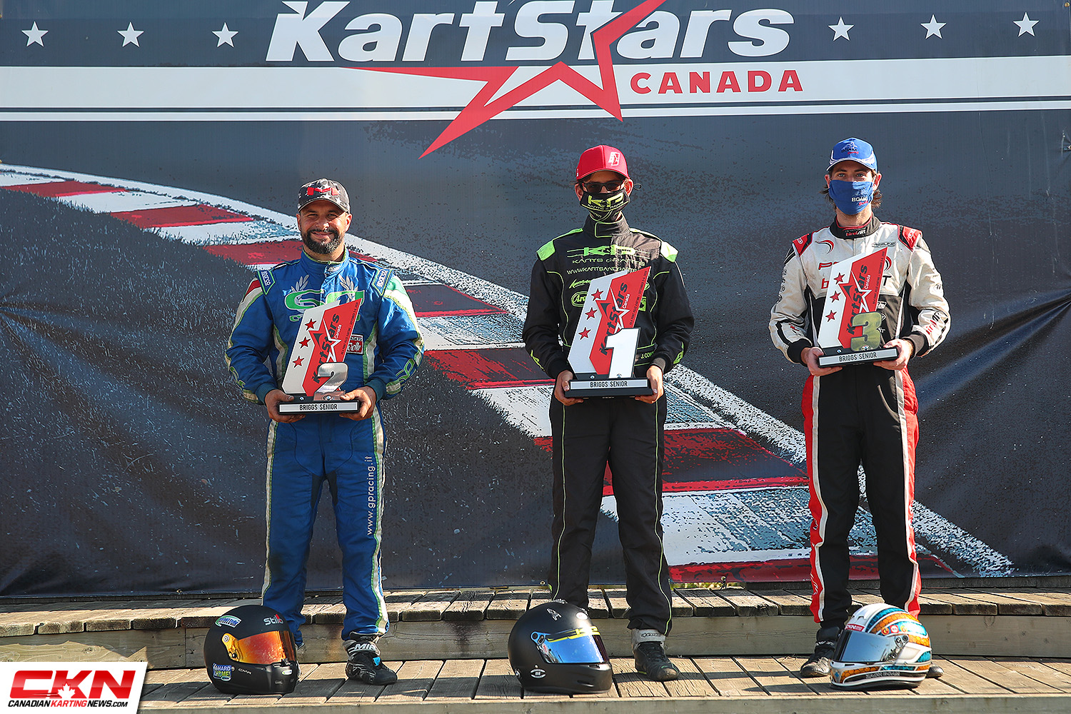 Jake Cowden (Awesome Kart) recovered from a tough opening lap to take home the KartStars Canada Briggs Senior race win and championship on Sunday at 3-S Go-Karts.