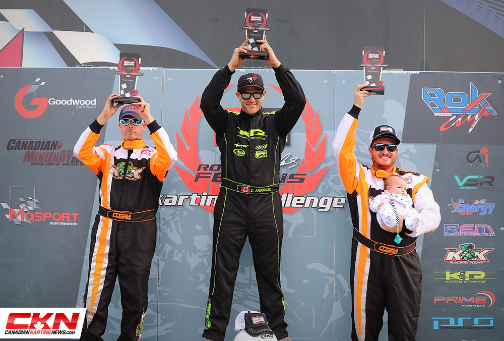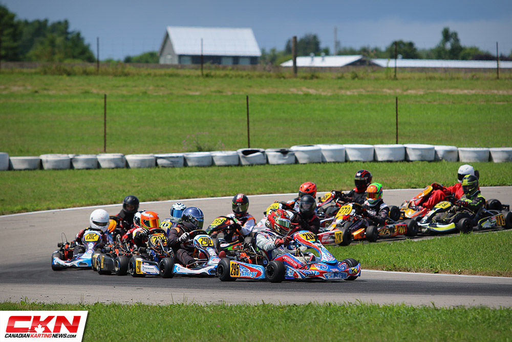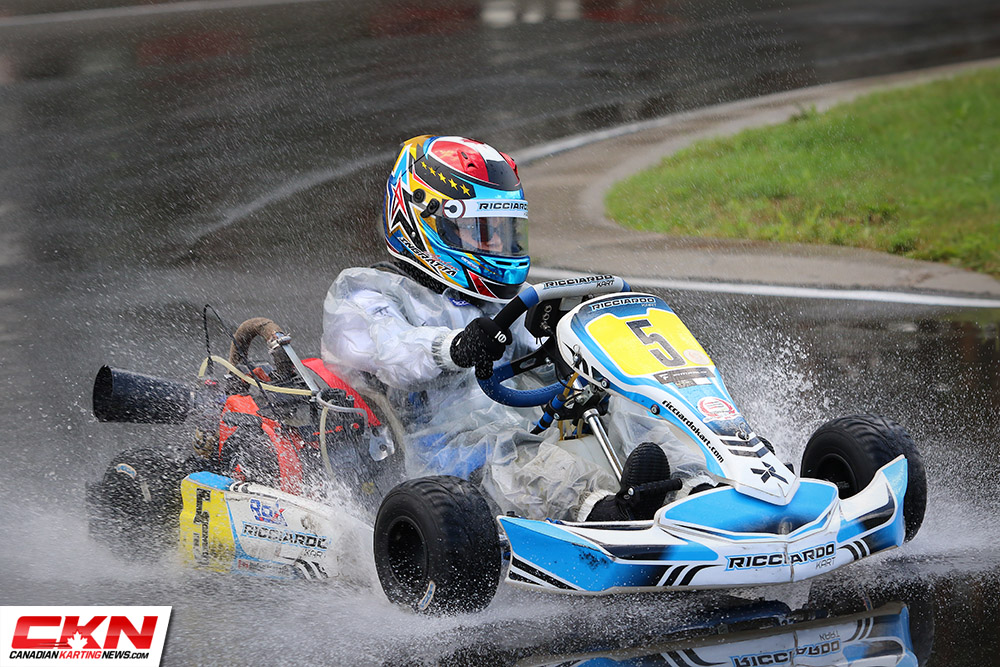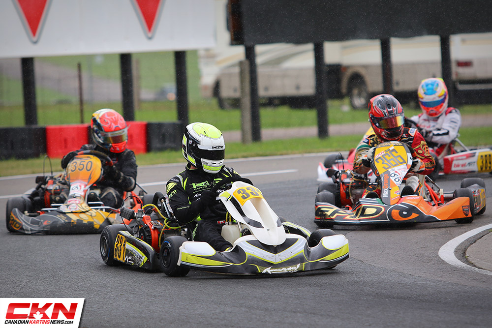 Managing the conditions best was William MacCormack (Awesome Kart). He started the race in the fifteenth position and credited his winter snowcross racing for helping him keep control in the unexpected conditions. MacCormack took the lead on the final lap from Mackenzie Matthews (Awesome Kart), who led most of the second half of the race. Third place went to Peter Zito (Intrepid) followed by Ethan Donkers (TonyKart) and Steven Navratil (Awesome Kart).
