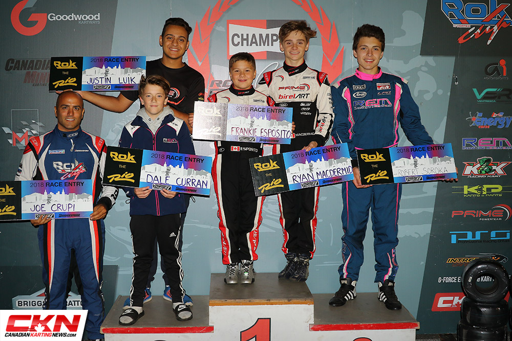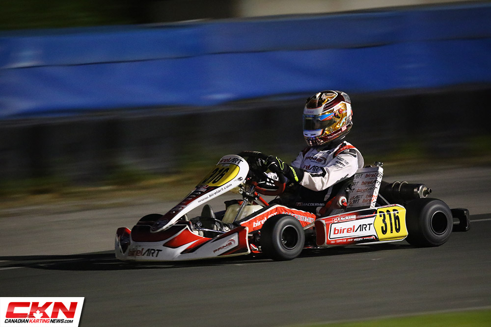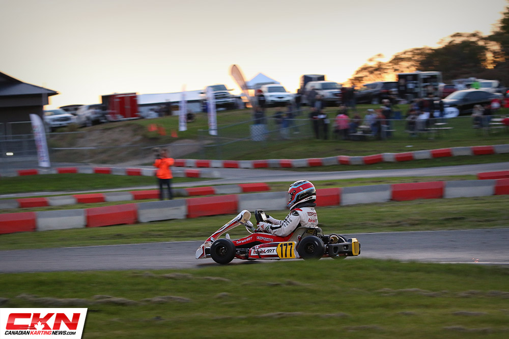 MacDermid swept the evening’s activities, overtaking Robert Soroka (REM/Kosmic) at halfway and then holding him off in the final laps to score the win. With Soroka finishing second, he confirmed the vice-championship and was awarded the ROK the Rio ticket with MacDermid already having one to his name. Both will represent Canada in Las Vegas.