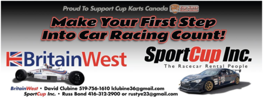 Cup Karts Canada is proud to announce a new sponsorship partner to help provide Cup Karts Canada competitors with an initial first step into car racing. The new partnership is between Cup Karts Canada, SportCup Inc and Britain West Motorsport.