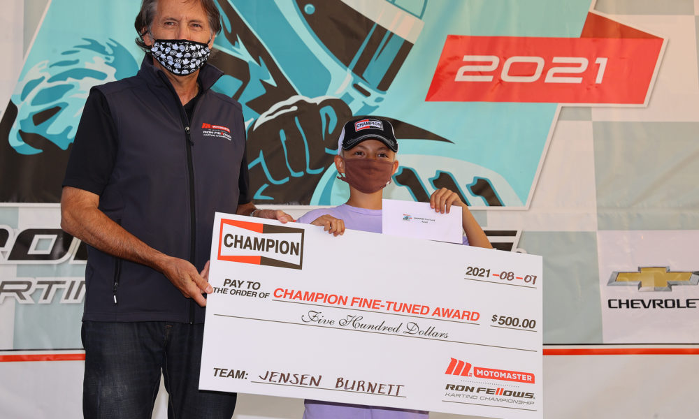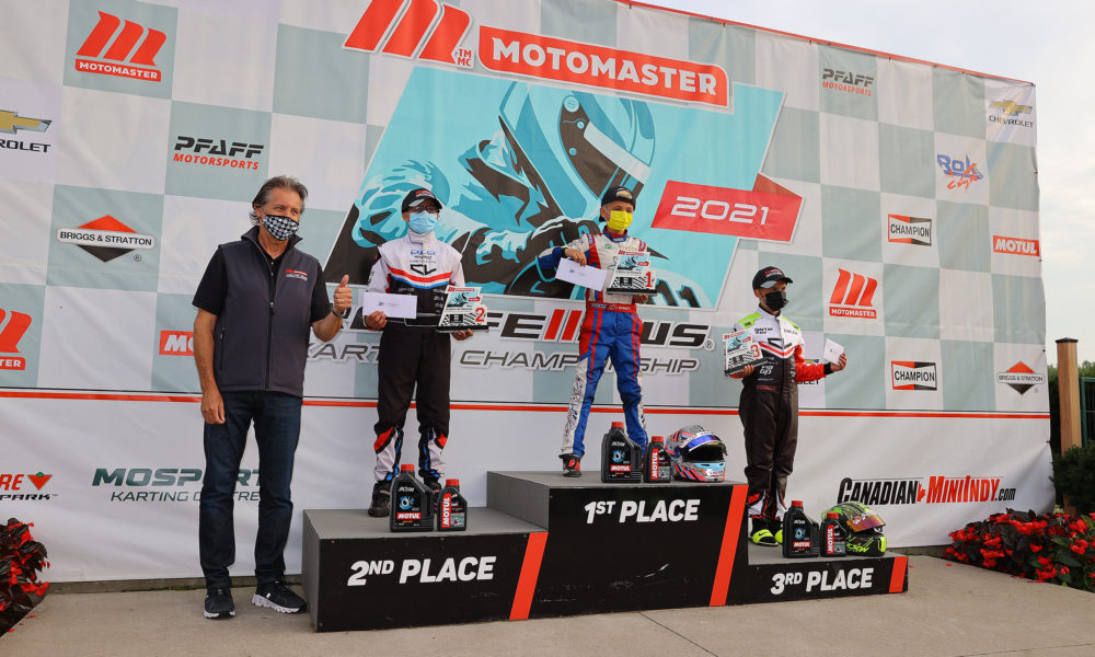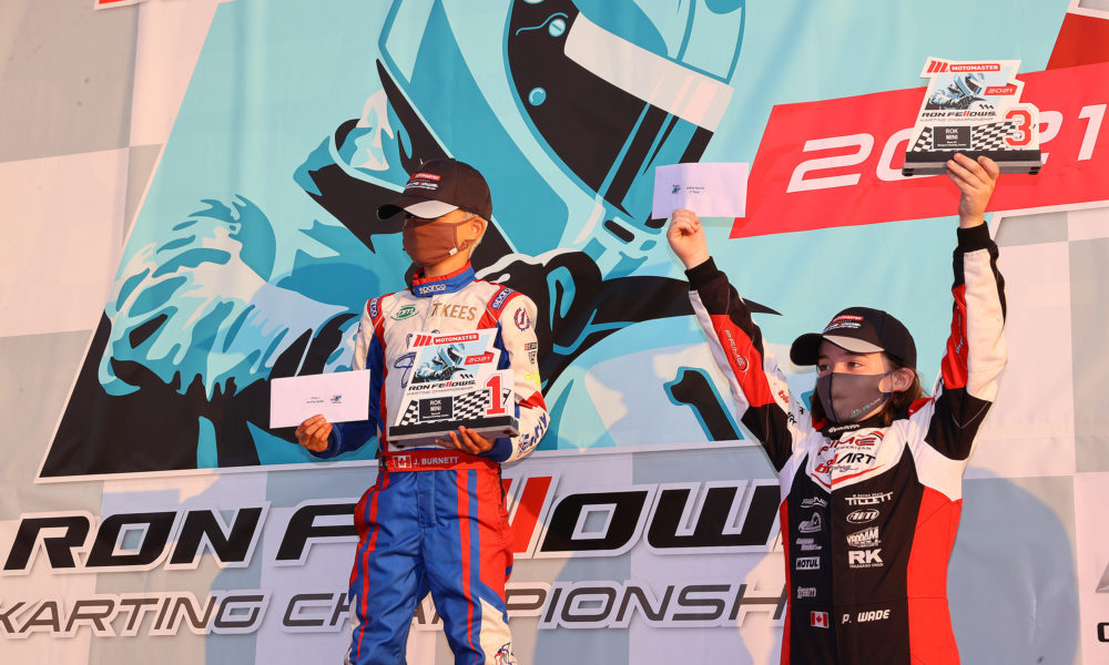 Jensen Burnett left his mark on the Mini Rok division this past weekend, scoring two dominant victories in the second round of the Motomaster Ron Fellows Karting Championship at the Mosport Karting Centre.