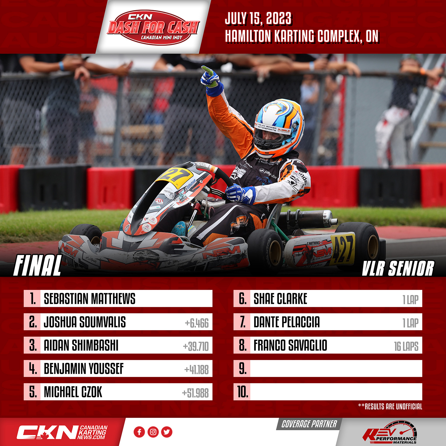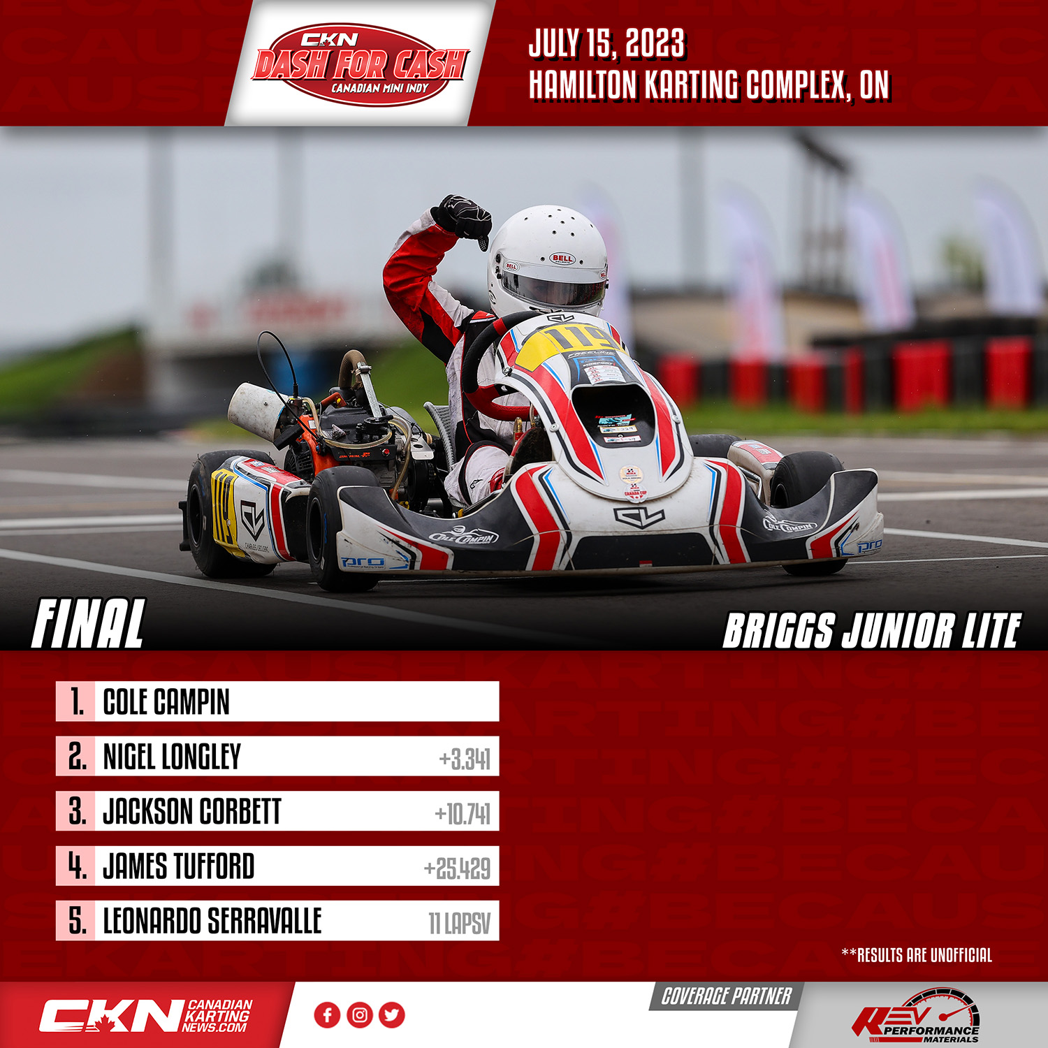 Rounding out the other race winners on Saturday and taking home $500.00 for their efforts were: Sebastian Matthews in VLR Senior, Carlo Lot in Briggs Cadet, Cole Campin in Briggs Junior Lite, Jackson Morley in ROK Mini and Rich Folino in Briggs Masters.