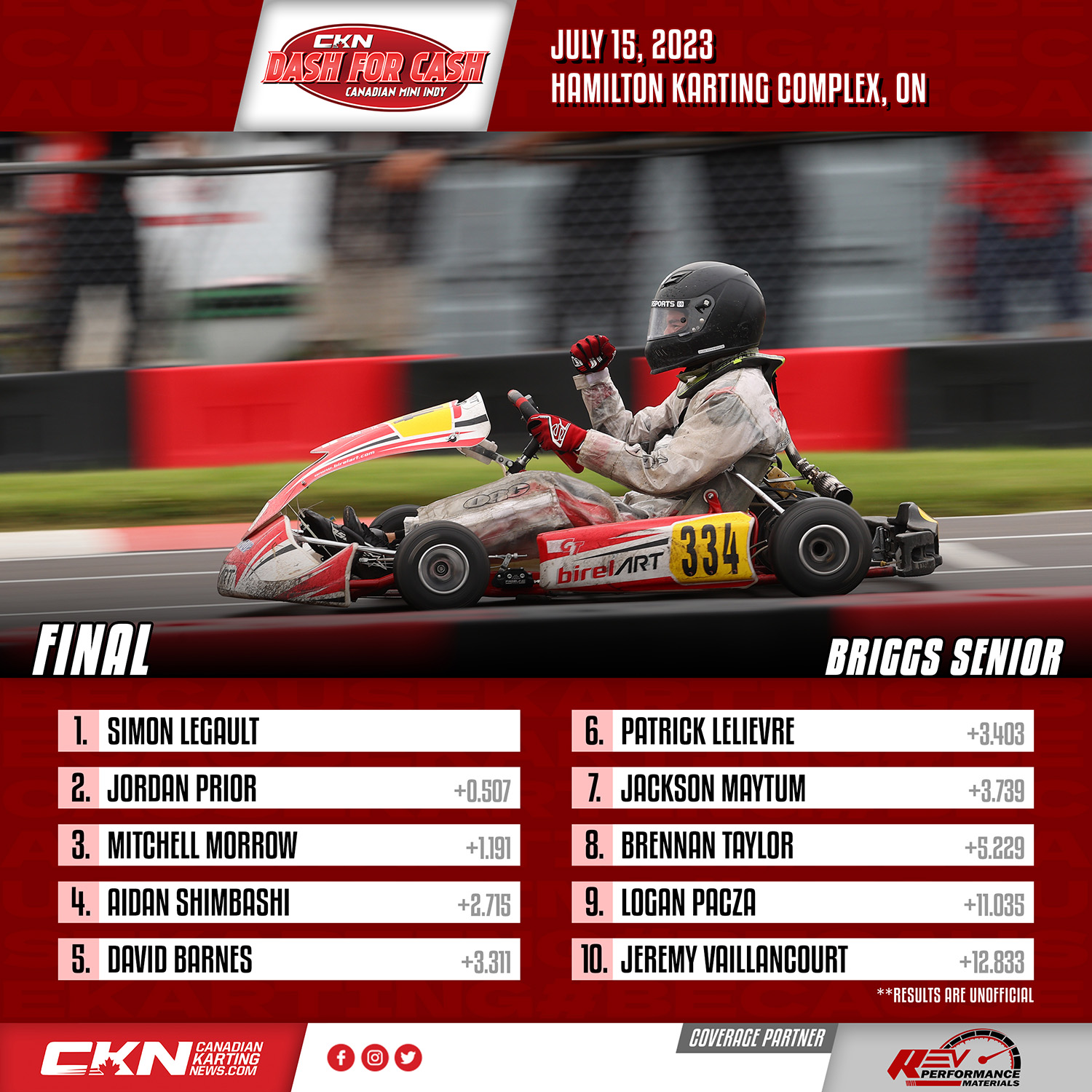 The biggest category for the day was Briggs Senior and a wet track for the Final was exactly what was needed to spice up the action. Jordan Prior (BirelART) was able to jump out front early and when his competitors were battling hard for second place early on, he found himself with a rather large lead. But with a track slowly drying, the pace of most drivers was changing as the race rolled on and in the late laps Simon Legault (BirelART) was able to not only track down Prior but easily roll past him into corner two and Prior could only sit and watch as his race and the nice $1000.00 payday pulled away from him on the final circuit.