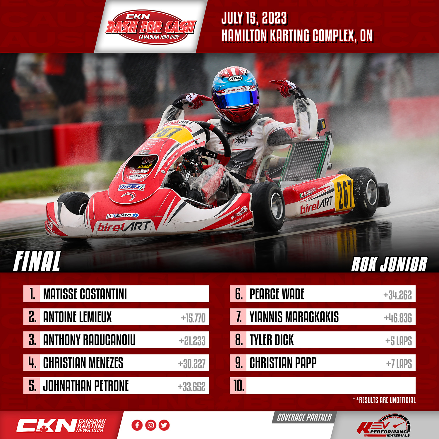 There was a pretty heavy rainfall during the ROK Junior Final but it was no match for Matisse Costantini (BirelART) as he drove away to a 15-second margin of victory over Antoine Lemieux (Kosmic).