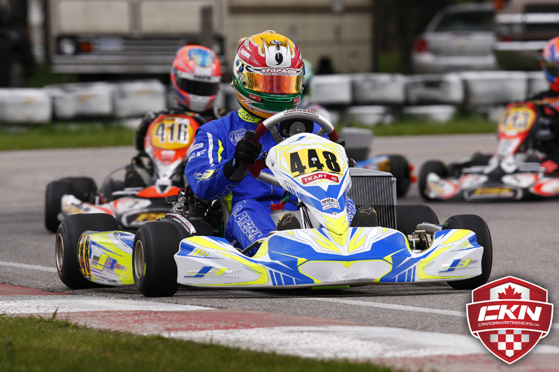 Lerra got the jump into the first corner of the Prefinal, but it didn’t take long for Bressan to gain the lead and he didn’t look back. Lots of shuffling through the heat changed the order, including an incident the claimed Darren White (Energy Kart Canada) and Brendon Bain (Maranello). Bressan scored the win ahead of Kingsley and Milan Dontje (PSL/CRG) of the Netherlands.