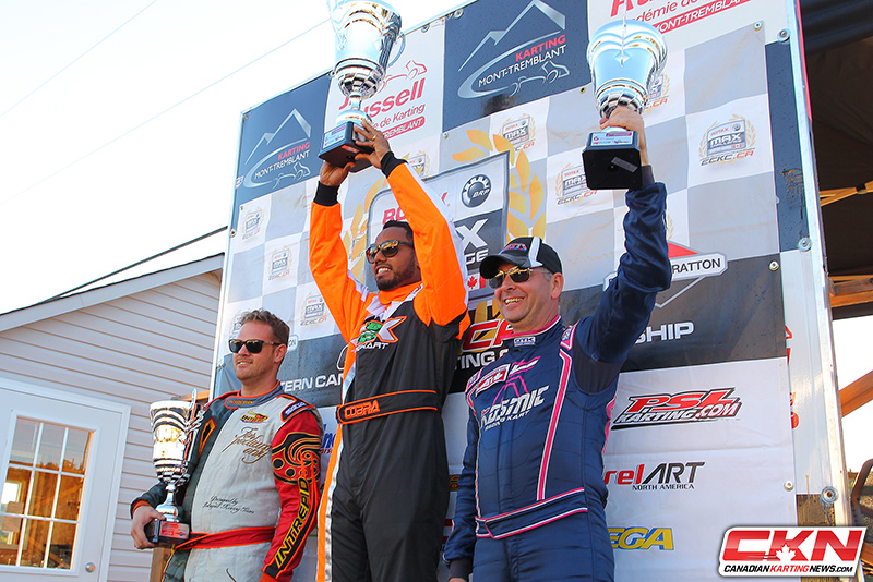 Taking the title in his first year back in karts, Mike Rogers tops the ECKC Championship podium with David Anderson (l) as vice-champion and Scott Jefferies (r) as third place. (Photo by: Cody Schindel/CKN)