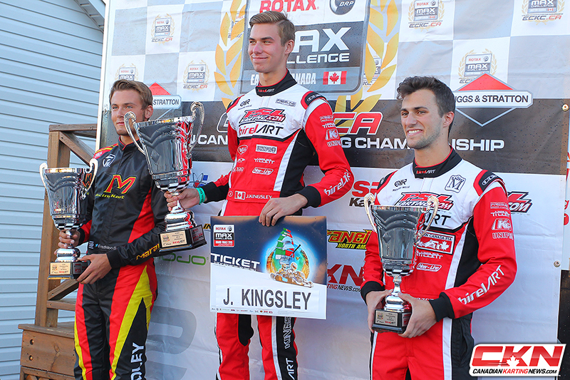 All three drivers returned to the podium for the championship standings that saw Kingsley on top by 170 points over Woodley, with Bizzotto another 149 back. All three drivers will represent Team Canada in Portugal at the Rotax Grand Finals along with Canadian Champion Tyler Kashak who was absent from Tremblant.