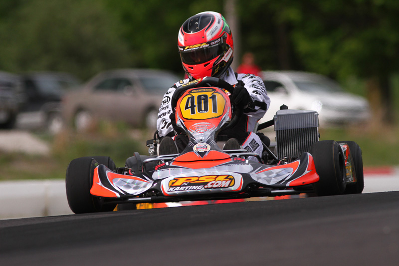 After the first start was waved off and restarted, the Rotax DD2 pre-final was finally under way with Pier-Luc Ouellette (PSL Karting/CRG) getting a nice push from his brother Hugo Ouellette (PSL Karting/CRG) to lead the way. Forced wide on the exit on one, Ben Cooper (SRA Karting/Birel) fell back to fourth behind Brendan Bain (Prime/Maranello).