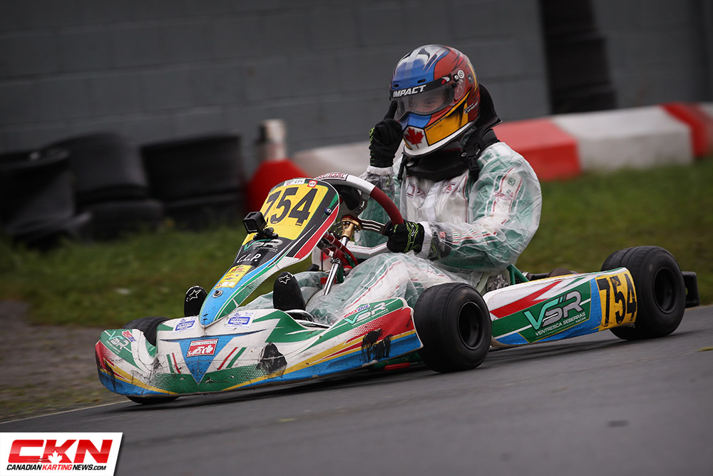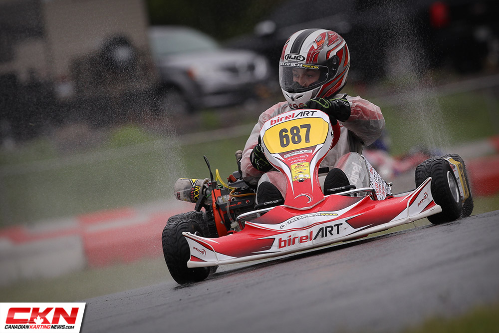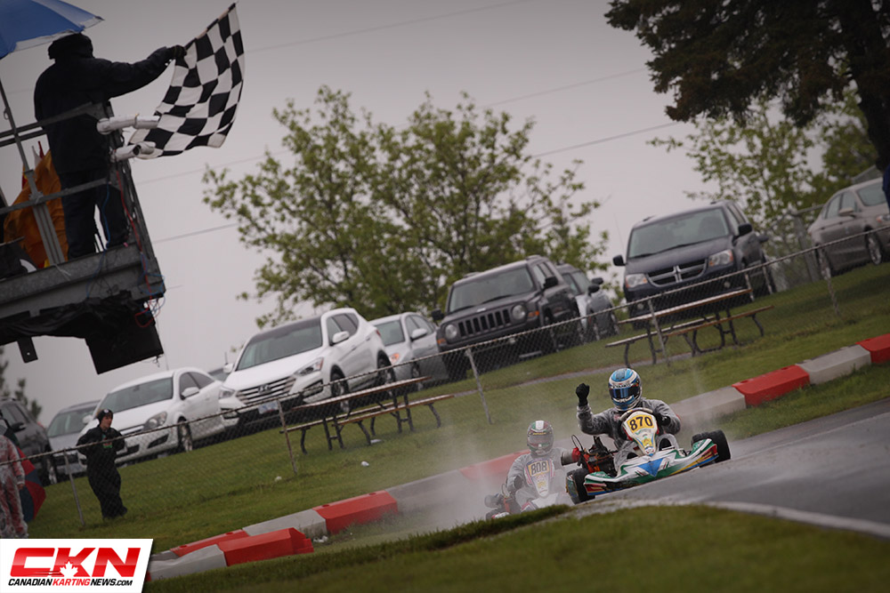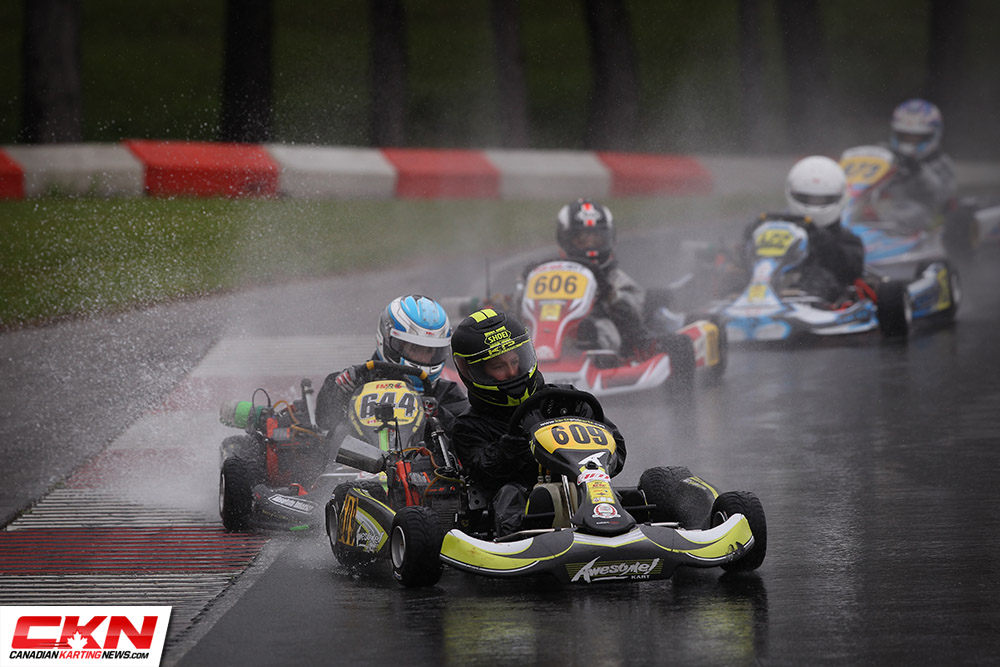 While Mother Nature delivered a perfect day for Saturday’s activities at Goodwood Kartways for the Eastern Canadian Karting Championship opener, Sunday was a completely different story as drivers arrived to a wet track with a morning drizzle. The cloud cover continued throughout the morning and just when everyone thought the track would dry out, another spurt of rain would fall sending everyone into a frenzy to switch their tires. Finally, just as the PreFinal racers were coming to a close, and with the majority of Briggs Senior on dry tires, the skies really opened up and it poured rain.