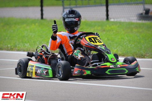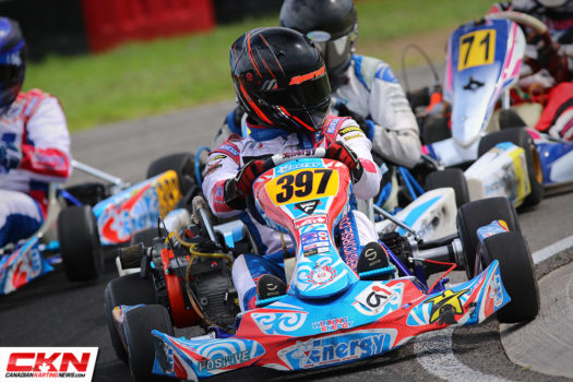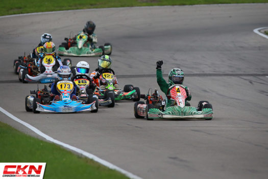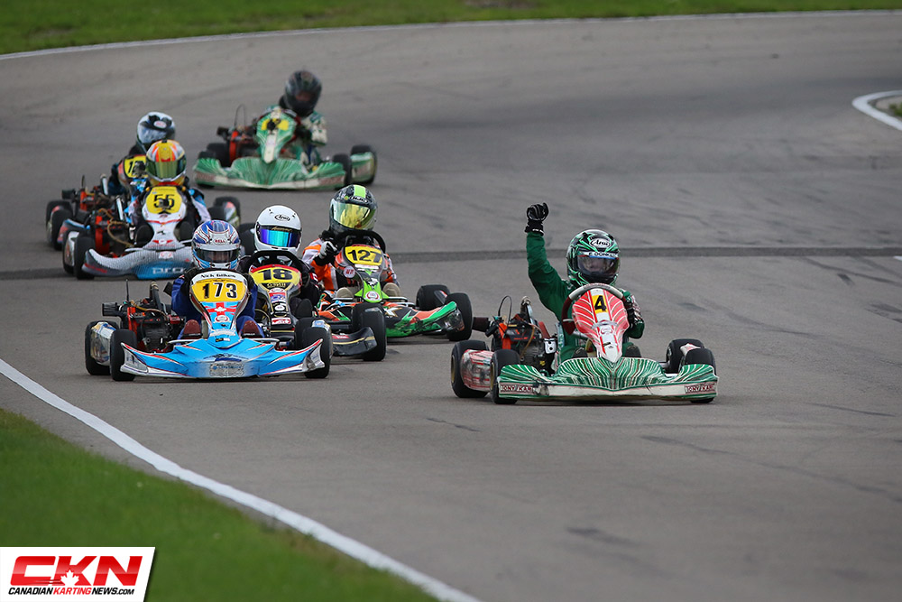 After a lap to bunch the group back up, Lupien led the field to green and everyone was off to the races. His lead lasted only four corners as Treadwell got under Lupien entering the bowl, sending him wide and into the marbles. At the same time, Signoretti got under Treadwell and he erupted with the lead as mayhem erupted exiting the bowl, collecting a large number of karts. Signoretti held the lead with two to go until Stehle worked his way back to the lead as the field received the white flag. A five-kart lead pack had emerged with Energy Kart teammates Signoretti and Da Silva behind Stehle, followed by Hornbostel and Marco Di Leo all in contention for the win.