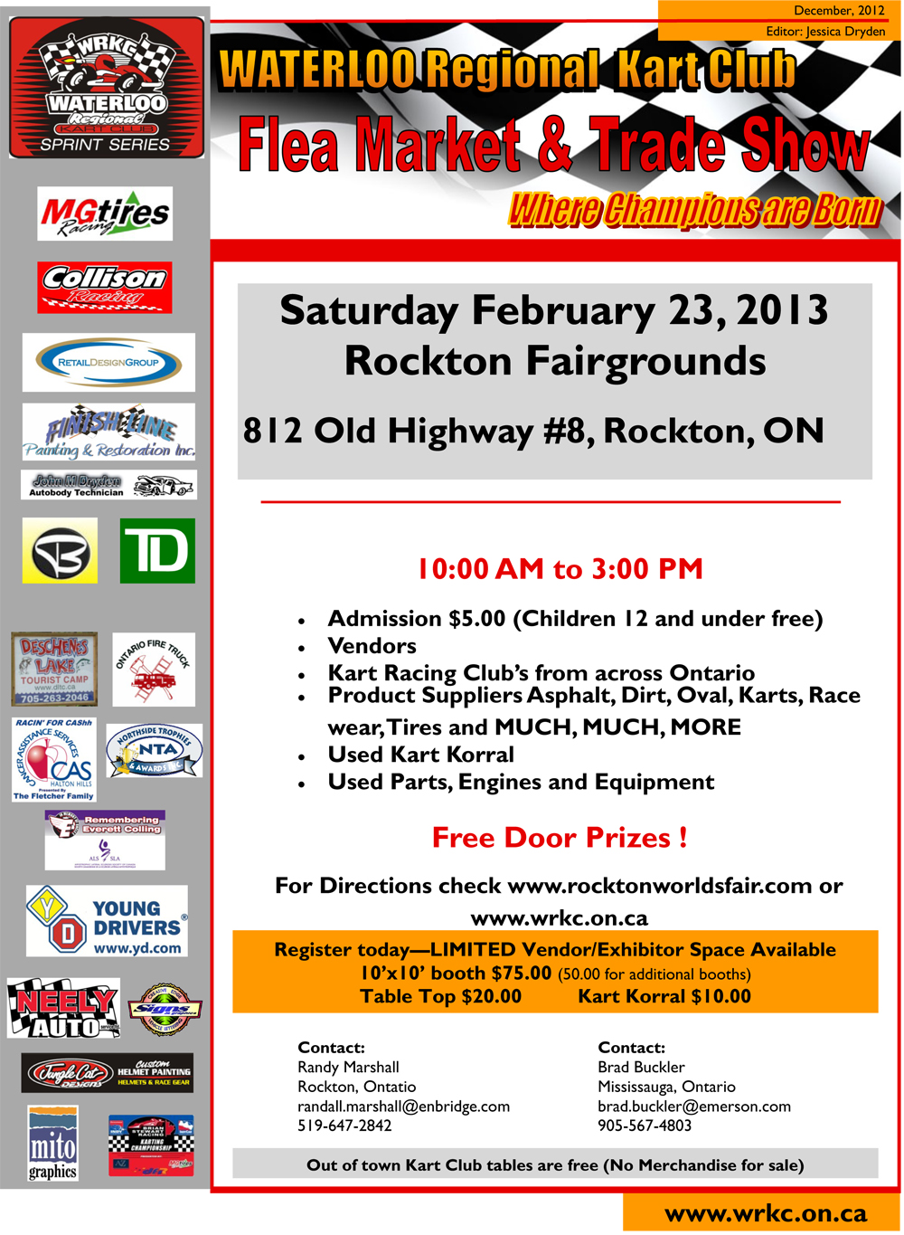 The Waterloo Regional Kart Club is pleased to announce that on Saturday February 23rd, we will be holding our annual Flea Market and Tradeshow at the Rockton Fairgrounds. The show will run from 10:00 AM to 3:00 PM. Admission is $5.00, children 12 and under are free. Door prizes will be drawn through out the day.