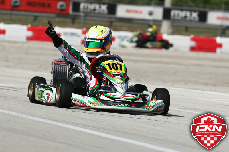 CKN_4234 copyAfter a red flag at the initial start of the Micro Max Pre final, Giovanni Bromante (TonyKart) would lead the field into the first corner with Dylan Tavella (TonyKart) and Derek Carmenate (TonyKart) following close behind. Bromante and Tavella would both work together and start to leave Carmenate behind in third. The battle for fifth was tight as seven karts would battle for the position as Guilherme Romano Peixoto would hold the position for majority of the race. Up front Tavella took the lead coming to the white flag, but Bromante would take the win with a pass in turn seven. Carmanate would cross the line in third ahead of Leonardo Rinaldi (Kosmic) and Peixoto.