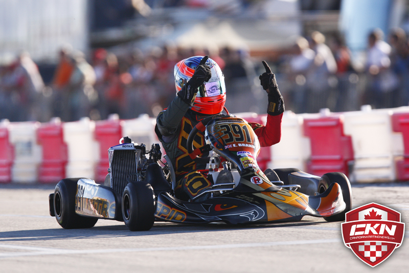 With all this action, Brand was able to drive off into the distance and score a huge victory. Askew ultimately recovered to second when things settled down with his teammate Kyle Kirkwood (OGP/TonyKart) finishing third. Szigeti enjoyed a great drive to finish fourth while Cooper made it back to fifth at the finish. Completing the top-ten were DeMelo, Roger Ralston (FA Kart), Myers, Jack Weprin (PSL/CRG) and Luke Varley (KMS/Birel) with Lennox eleventh.