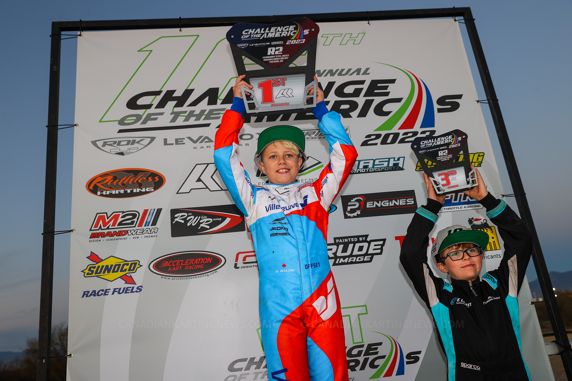 Balog competed with Team RaceLab aboard a JV Kart as one of a number of Canucks racing in Tucson. Both Saturday and Sunday’s Finals were tight races at the top with Balog and fellow Canadian Luca Popescu taking their turns leading. Popescu ended up second in the Saturday Final and was the first to cross the finish line on Sunday, just ahead of Balog, but a penalty for contact early in the race knocked him off the podium and elevated Balog to the top step. These two have shown they will be in the running for the title this winter and we can’t wait to see how rounds two and three go.