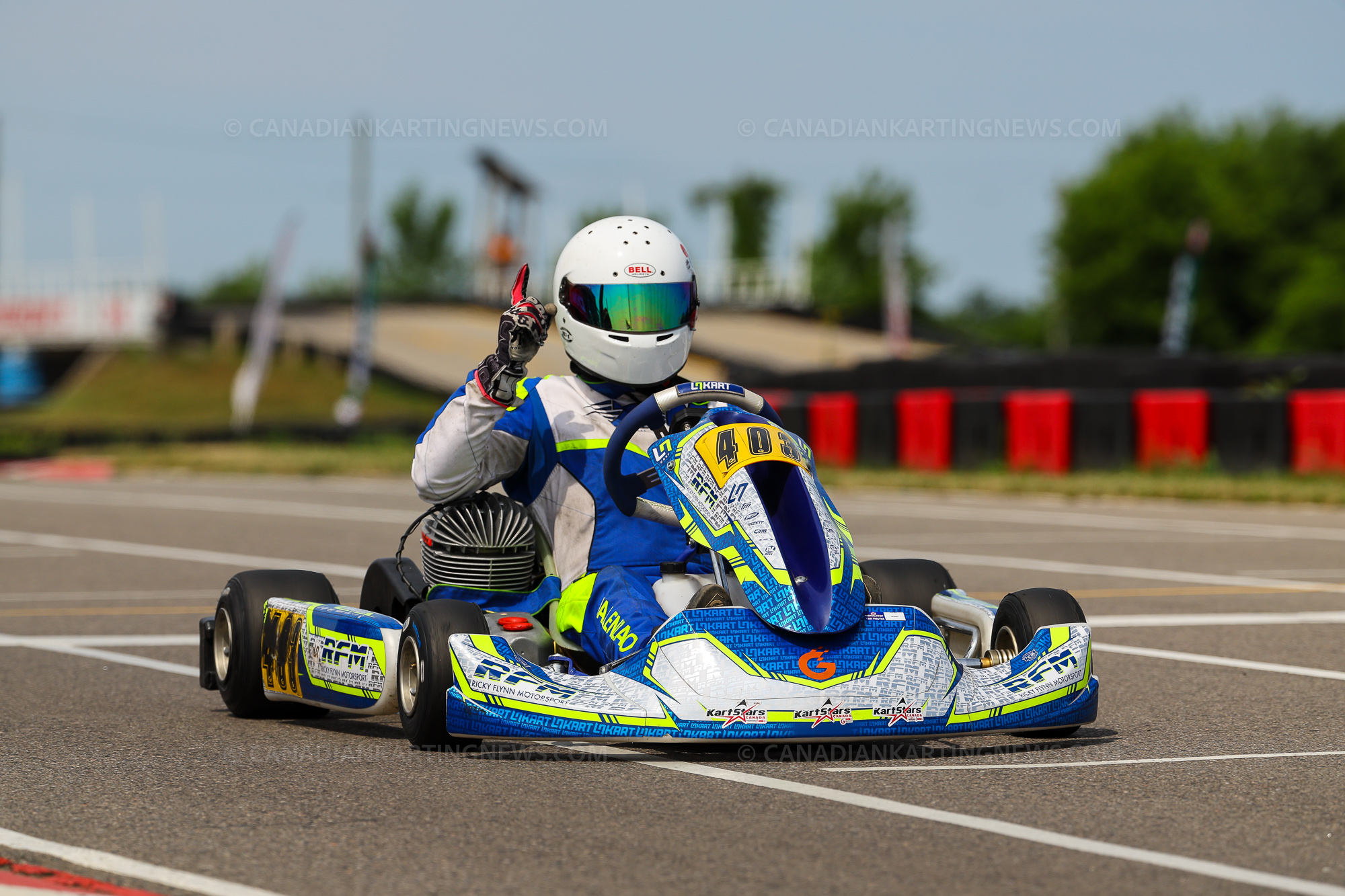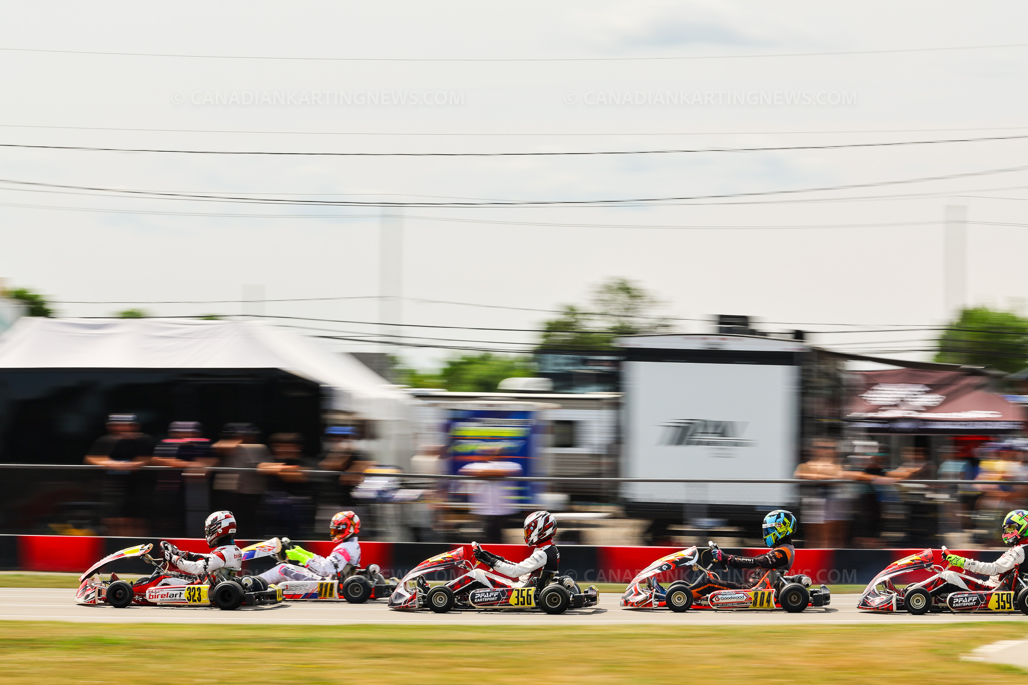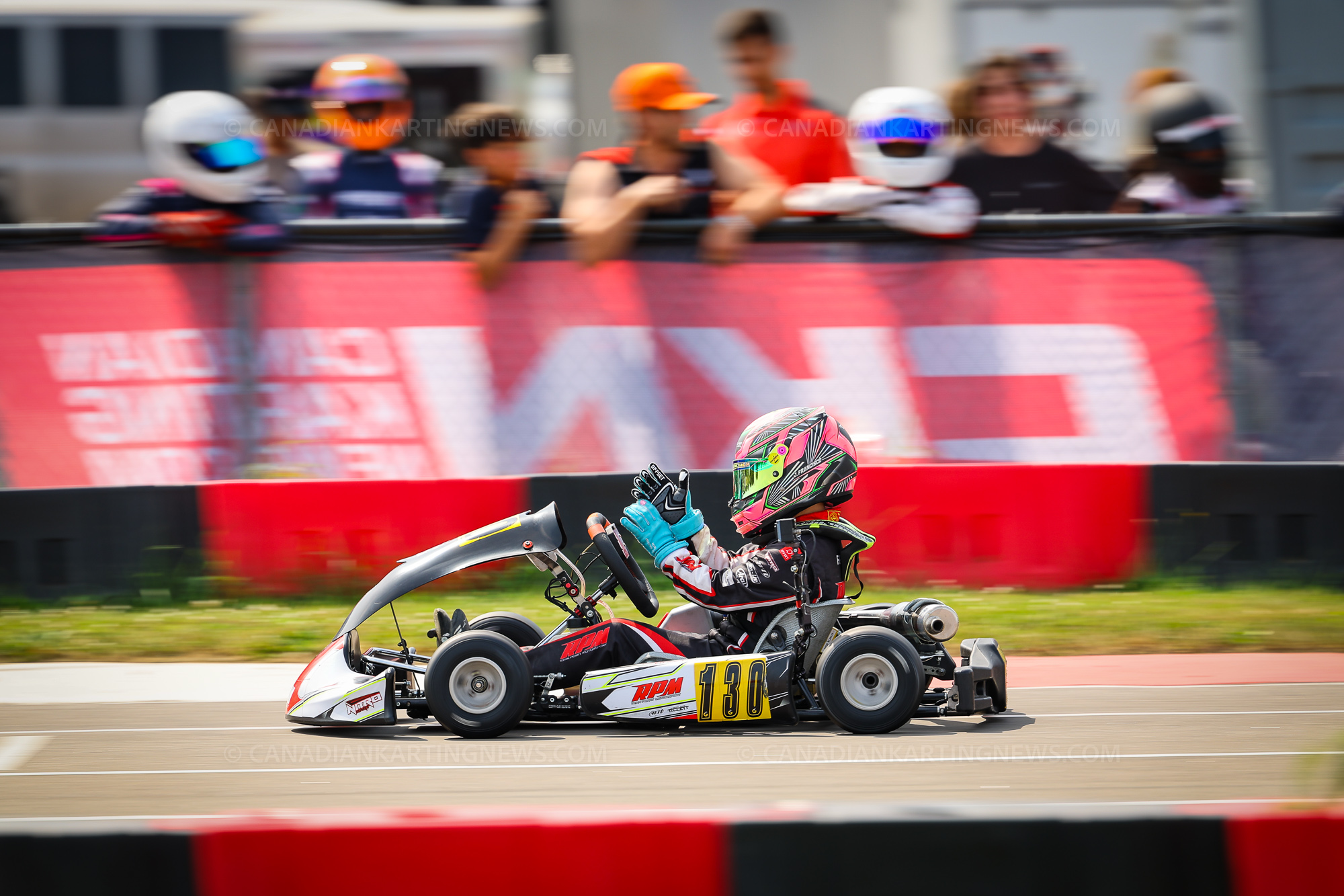 Mini ROK delivered one of the most entertaining races of the weekend, with Jayden Francisco (Nitro Kart) fending off two fierce challengers in his return to Canadian competition. Running nose-to-tail from start to finish, Francisco had Christian Damianidis (Parolin) and his cousin Liam Francisco (Nitro Kart) shadowing his every move. Despite the constant pressure, Jayden kept calm and collected to secure the win, with Damianidis finishing second and Liam close behind in third.