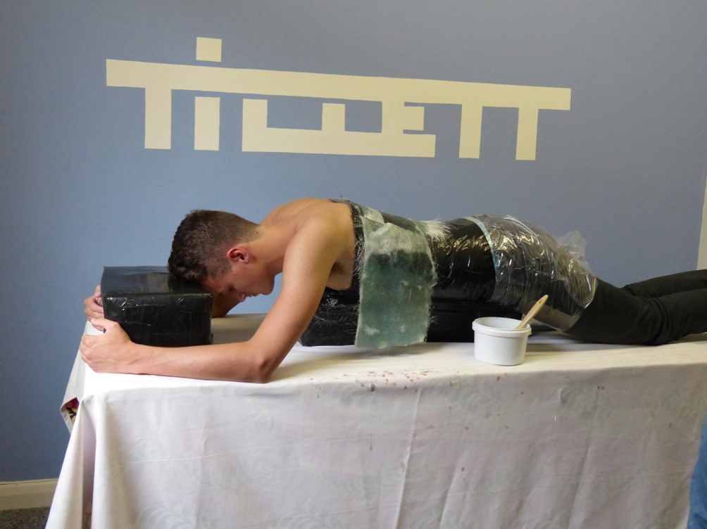 Owner Steve Tillett took us up into the custom rib protector room where I would be getting fitted. The first step was wrapping my whole body with tape, which was not fun taking off by the way. I laid down on the bed and Steve began to lay each layer of fibreglass down. The process took about 35-45 minuets. At one point I started to get a little worried when Steve was talking to my parents and I was laying there the material started getting almost uncomfortably hot. Once the rib protecter dried a little Steve removed it from my body and took the tape off as well. My job was done and the rest was up to Steve to cut and finish the rib protector.