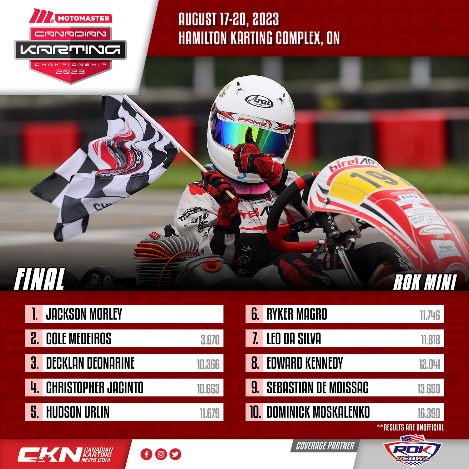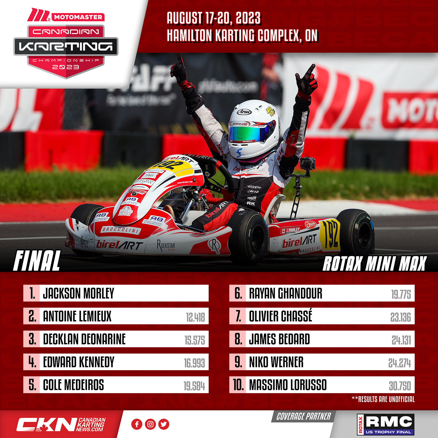 Joining Morley on the podium in Mini Max were Antoine Lemieux and Decklan Deonarine. For their efforts between the Canadian Championships and the Canadian Open at ICAR, Lemieux and Edward Kennedy were awarded tickets to the Rotax Max Challenge Grand Finals.
