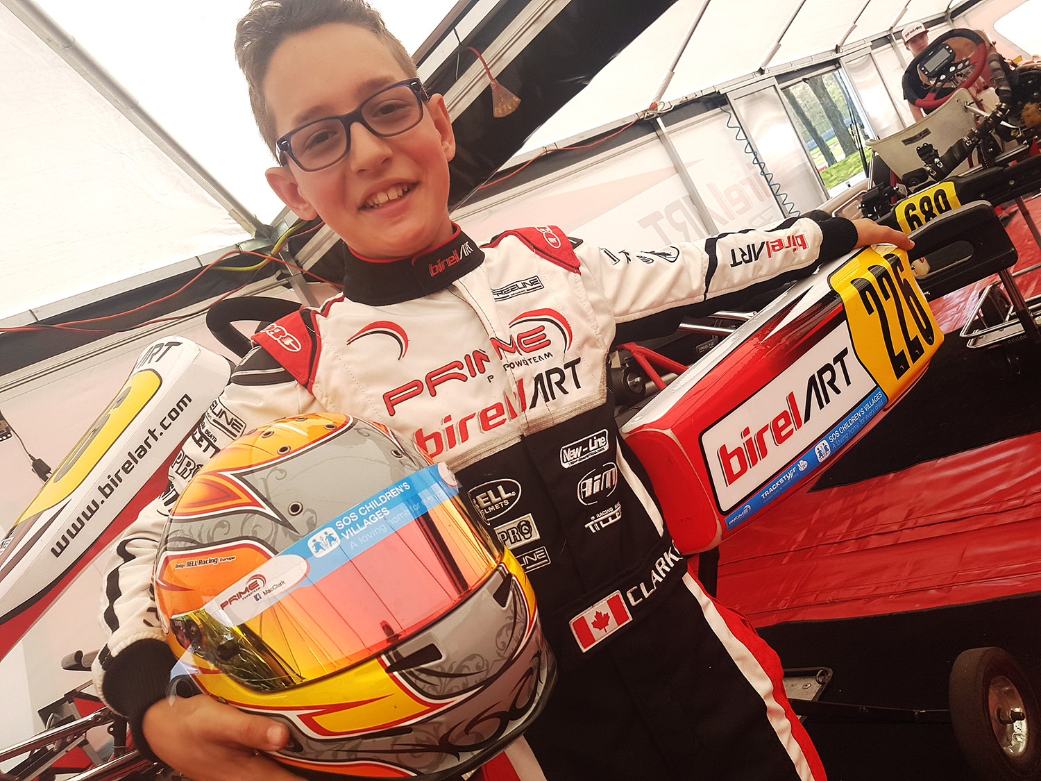 Mac proudly displaying the SOS Children’s Villages logo on his race helmet and kart. (Photo courtesy: Stu Clark)