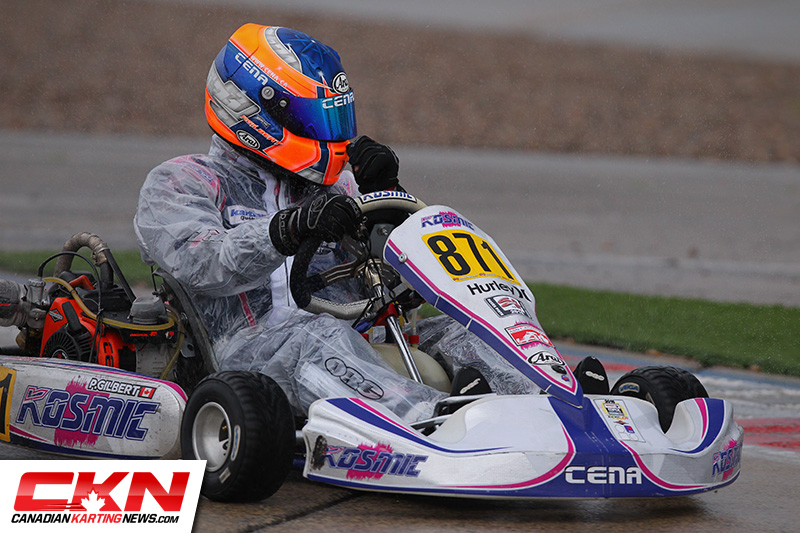 Back to to the leaders, Gilbert waited until lap ten to work his way by his teammate for the lead. From there he managed to keep Jefferies at bay and scored the win. Mario Martin (TonyKart) took advantage of a struggling Yanko to grab the third position with Yanko finishing fourth and Corey Walsh fifth, the last of the drivers on rain tires. David Anderson (Awesome Kart) was sixth on slicks.