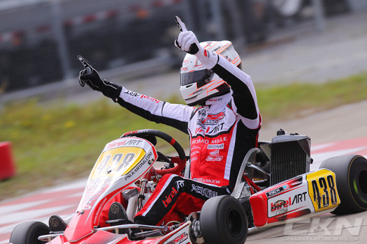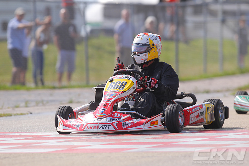 Championship leader Ryan MacDermid recovered from a tough start to slot into second on lap two and had his sights on Brueckner until heartbreak happened on lap four. Exiting the second corner, MacDermid’s kart did not accelerate, a broken throttle cable the culprit, ending his race and his bid for the title.
