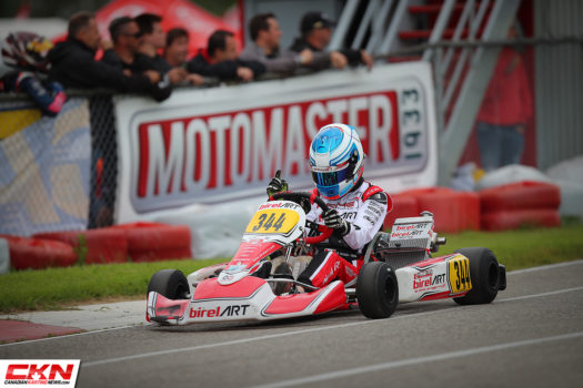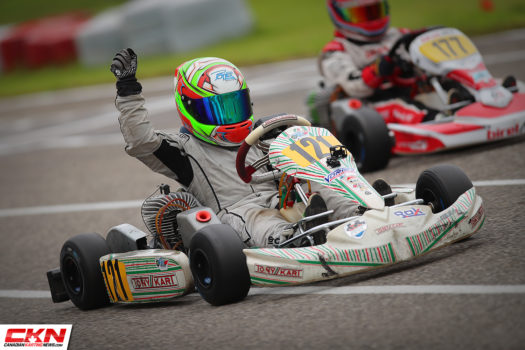 Newton got out to the early lead and was doing great to manage the slippery conditions. But as the leader, and the rain falling more and more each lap, he was always the first to test the limits each corner each lap, and unfortunately, turn six for the best of him on lap eight. Exiting the corner a little too hot, Newton’s kart spun and he had to watch the entire field drive by before he could resume. Esposito gained the lead from that opportunity with Joseph Launi (Innisfil/TonyKart) starting to close in on the new leader. And just like he did on Sunday in Goodwood, Launi put all the pressure on the leader in the final laps, pounced at an opportunity on the final lap to overtake the leader Esposito and score his second Sunday victory of the season.