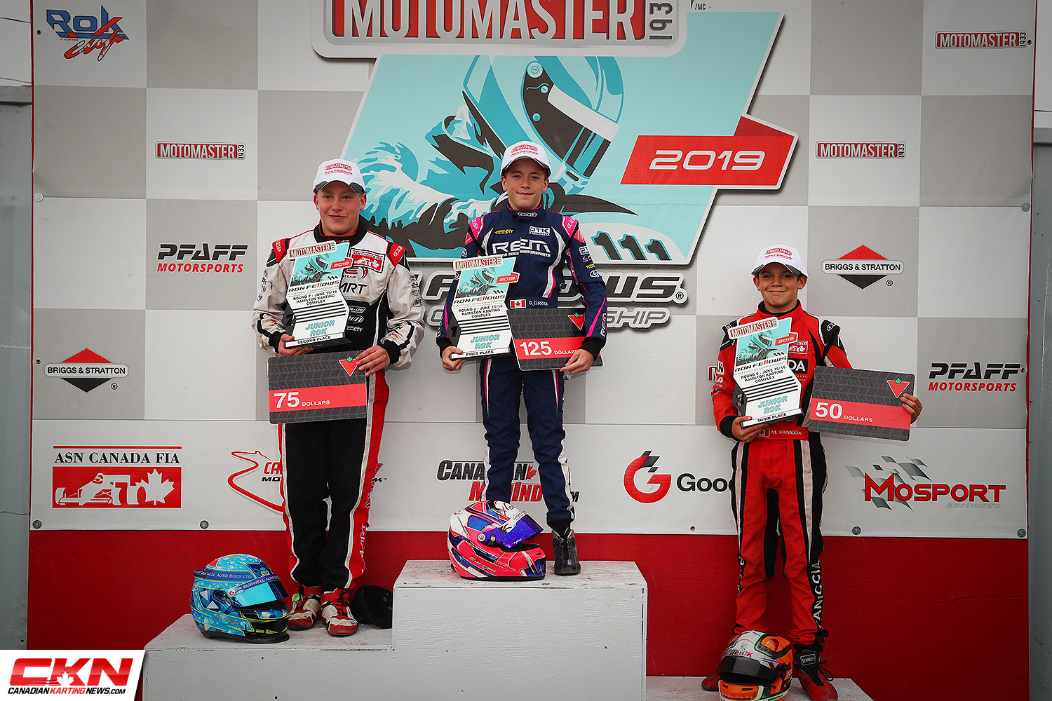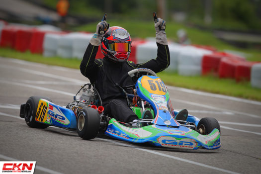 Once again, Masini was in on the battle for first, but this time it was with Stefano Lucente (Innisfil/GP Kart). The pair traded the lead in the first two laps while trying to get as much heat in their tires at the same time to tackle the slick track. As the rain stopped and the track came back to life, Lucente got quicker and quicker, pulling away from Masini to take his first victory of the season by 1.5 seconds. Conquer wound up third for the second day in a row.