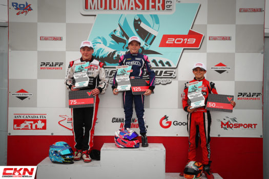 Unpredictability is a very good way to describe round two of the 2019 MotoMaster Ron Fellows Karting Championship at the Canadian Mini Indy Karting Complex in Hamilton. From minute to minute, Mother Nature couldn’t decide what the weather was going to be, changing forecasts and current conditions with the snap of her fingers from the sunrise on Saturday to the setting on Sunday. And nobody could have predicted that there would be eight different race winners in the Rok Cup classes, proving these four championships will come down to the wire.