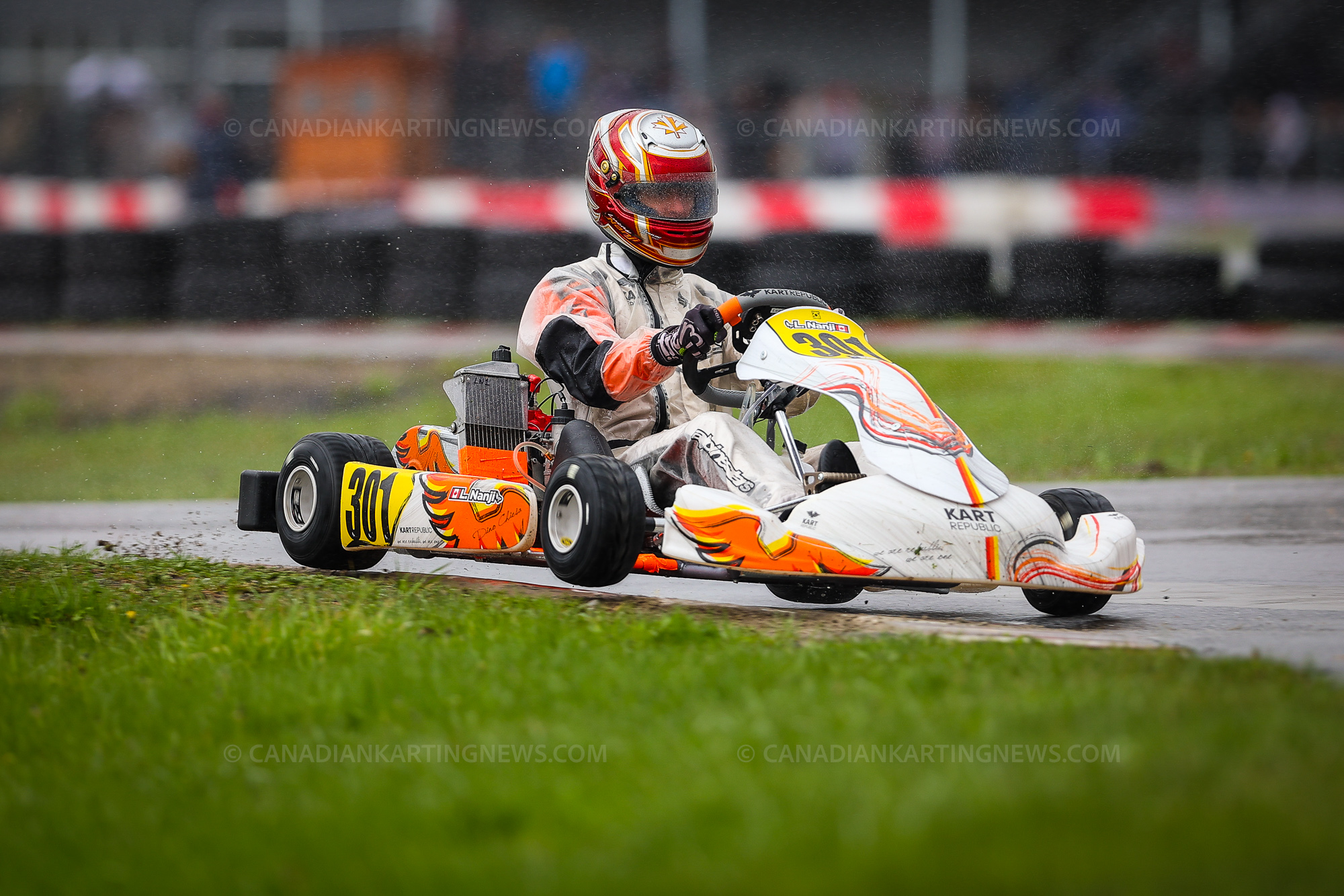 Leaving his mark in the final race of the day, David Laplante (Premier/TonyKart) dominated the Rotax DD2 Masters race in the cold rain. Laplante pulled out a 9.6-second victory over Francois Dulac (CRT/OTK). Taking third place was Maximilien Gareau (CRT/MG Kart) who just edged out his teammate Alexandre Gauthier (CRT/RedSpeed) for the position. Fifth went to Martin Verville (BirelART) while we want to give a shout-out to sixth-place finisher Tyler Givogue (Nonstop/Formula K), who marked his return to karts after nearly 20 years away from the sport.